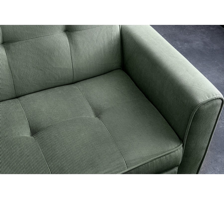 Sedačka je čalouněna manšestrovým potahem v zeleném odstínu, který působí sofistikovaně a zároveň útulně. Sedací část i zádová opěrka jsou prošívané do čtvercového vzoru, který dodává designu strukturu a moderní výraz. Dekorativní prošívání lemu na sedadle, bočních opěrkách i opěradle podtrhuje precizní zpracování a vytváří vizuálně jednotný celek.