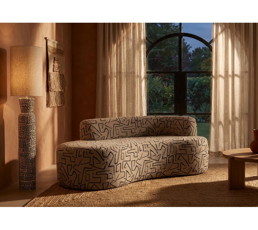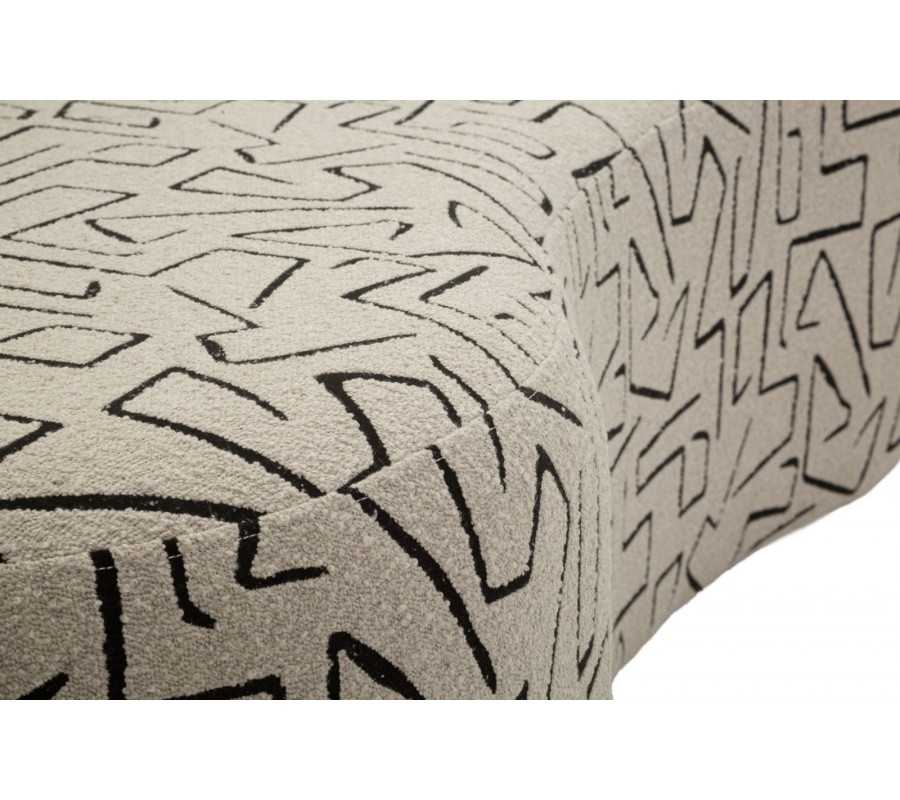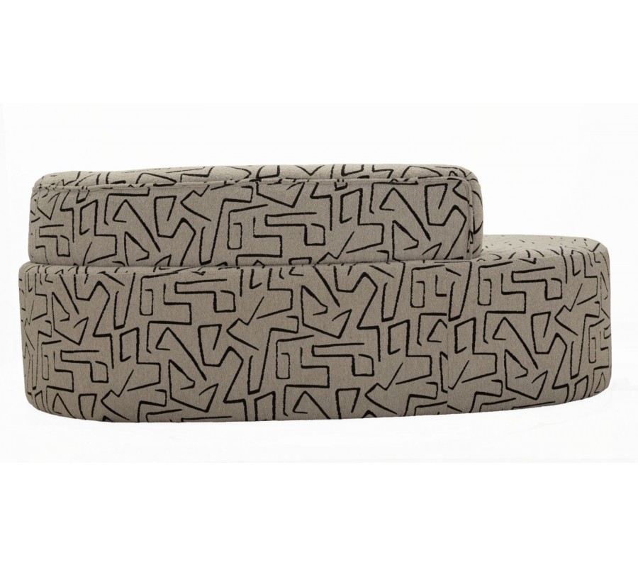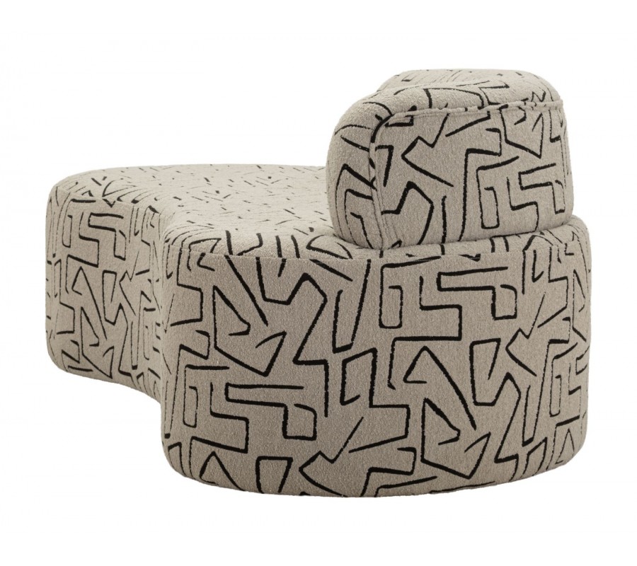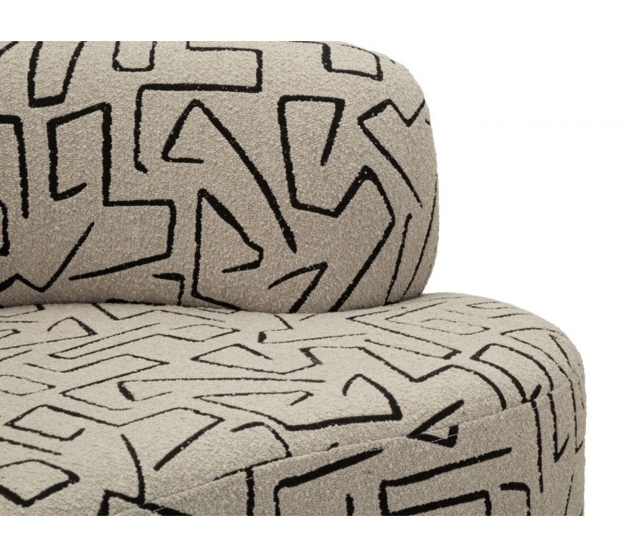 Designová sedačka Terezja je výrazným a originálním solitérem, který do interiéru přináší moderní umělecký charakter. Její atypický, organicky zaoblený tvar působí měkce, sochařský a zároveň velmi současně. Béžový buklý potah je oživen kontrastním černým geometrickým vzorem, který připomíná abstraktní linie a dodává sedačce osobitou vizuální identitu.