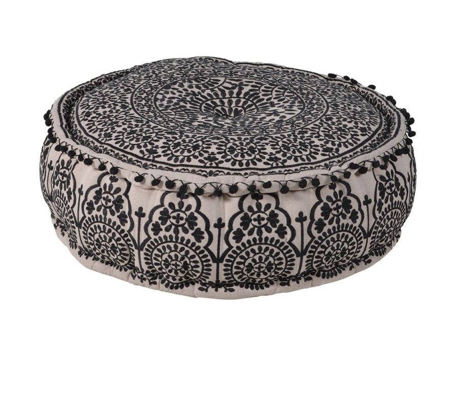 Etno kulatá taburetka Lana z bavlny s béžovým podkladem a černým vzorem 58 cm