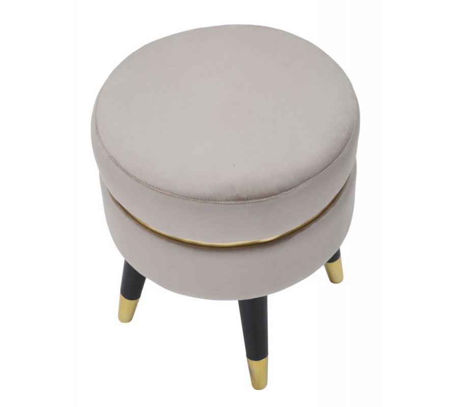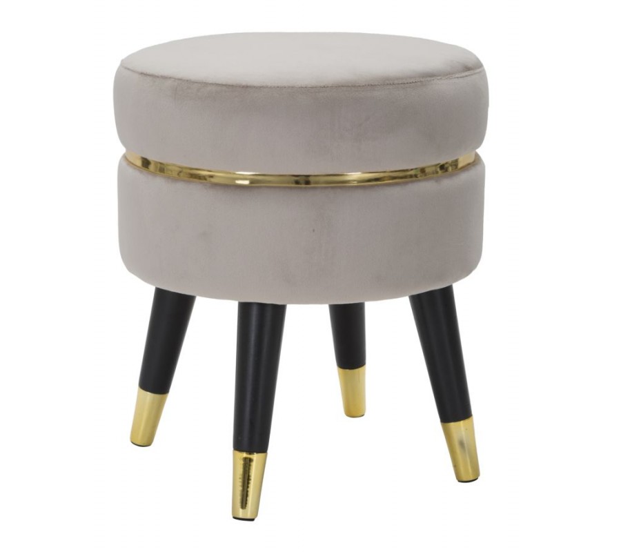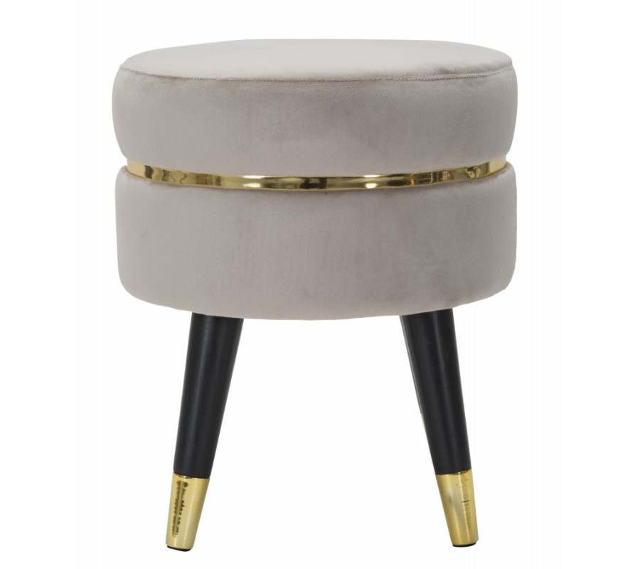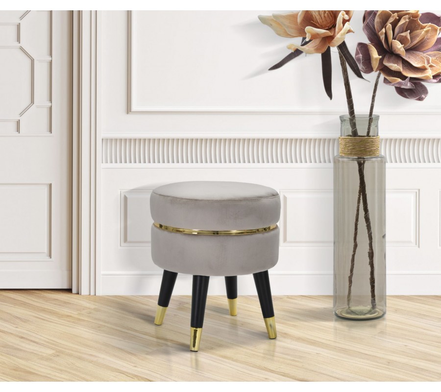Art deco kulatá čalouněná taburetka Laurentia se sametovým šedým potahem a černými nožičkami se zlatými detaily 40 cm