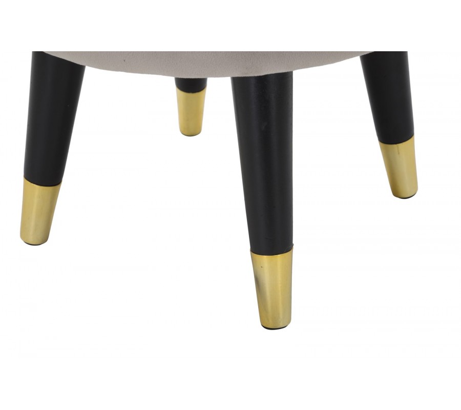 Luxusní nádech podtrhují zlaté detaily, které se nacházejí po obvodu taburetky a na koncích jejích čtyř černých nožiček. Tato kombinace vytváří atraktivní kontrast mezi světlým čalouněním a tmavýma nohama.