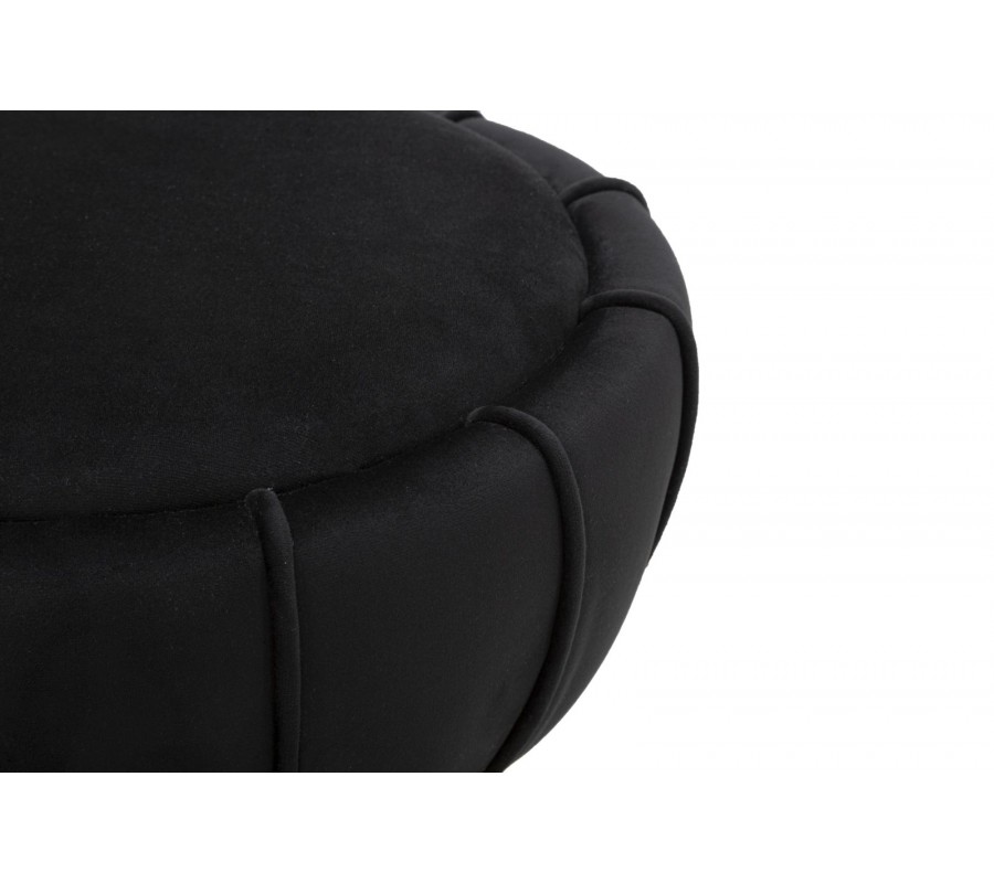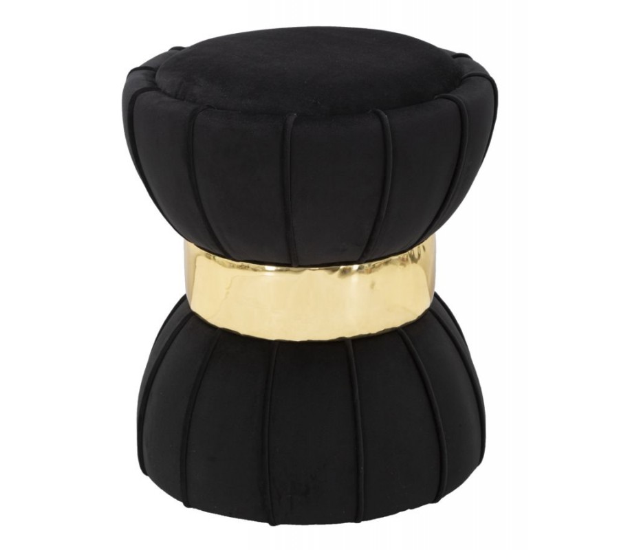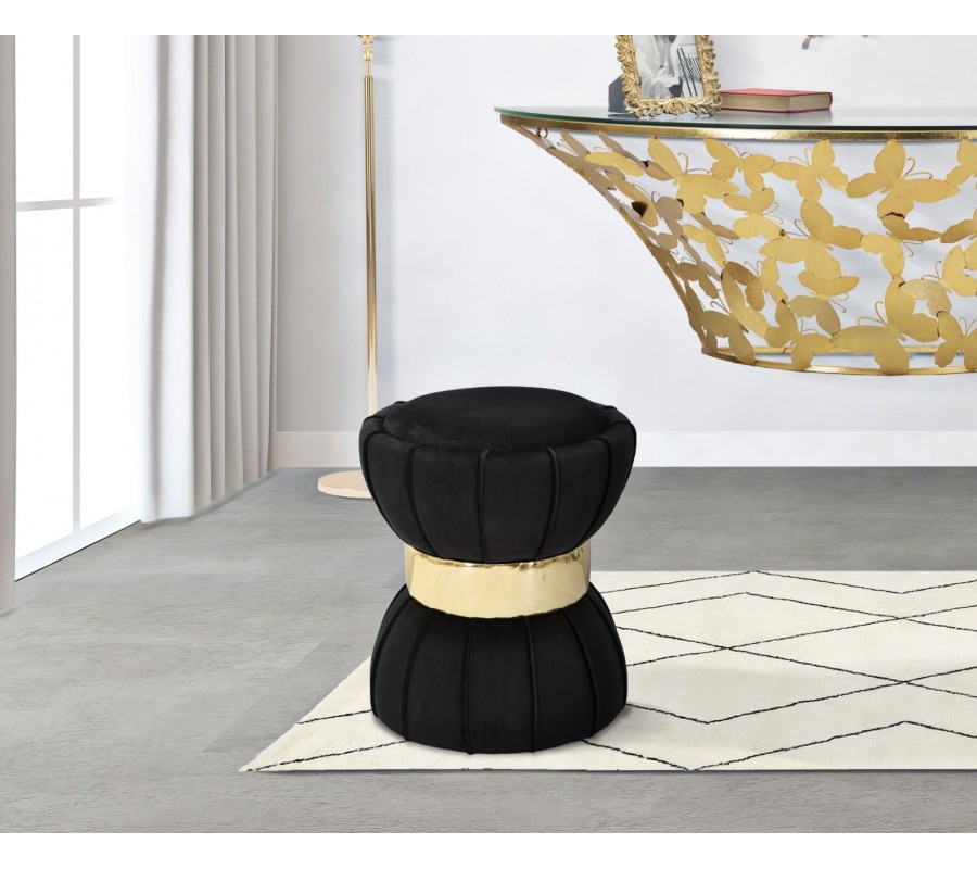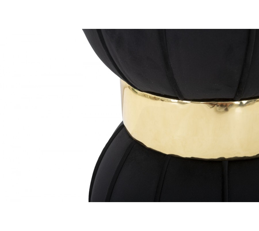 Konstrukce je vyrobena z pevného masivního dřeva a pokrývá ji měkké pěnové čalounění. Potah je vyroben ze sametové textilie v černé barvě. Její jemná struktura výborně koresponduje s lesklým zlatým provedením horizontálního detailu, který dodává taburetce luxusní glamour vzhled.
