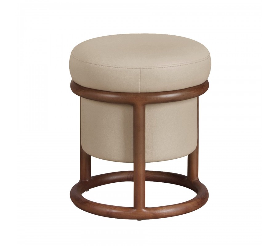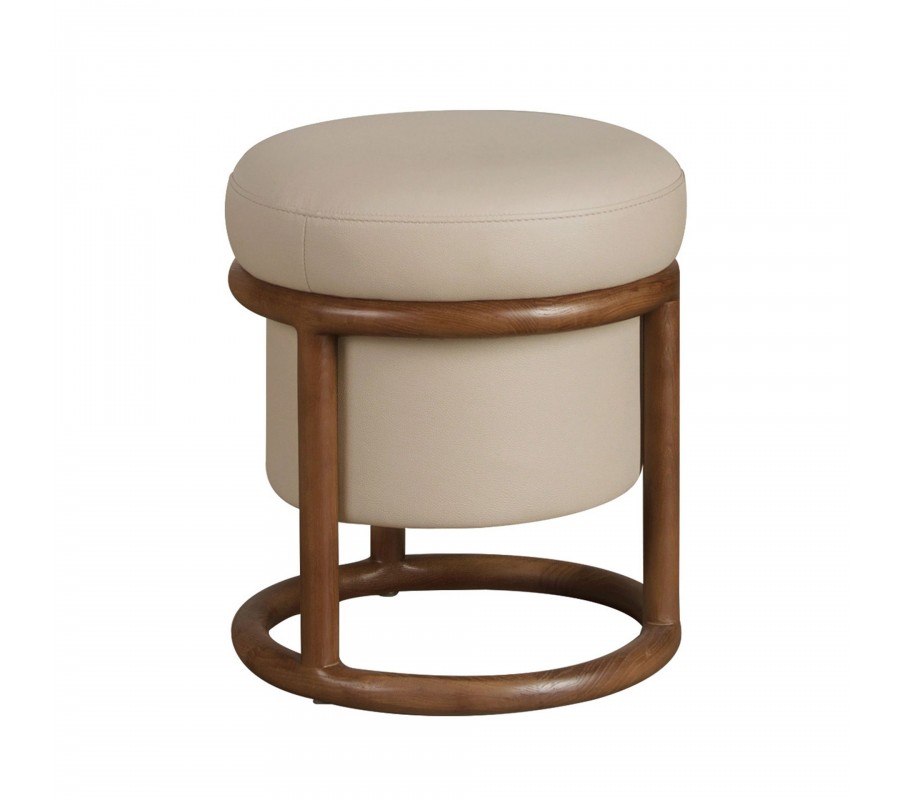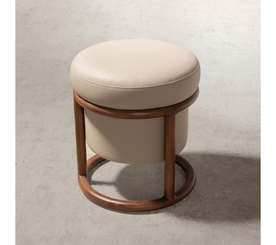 Luxusní moderní kulatá taburetka Vita Naturale v béžovým koženým potahem a hnědou designovou konstrukcí 40 cm