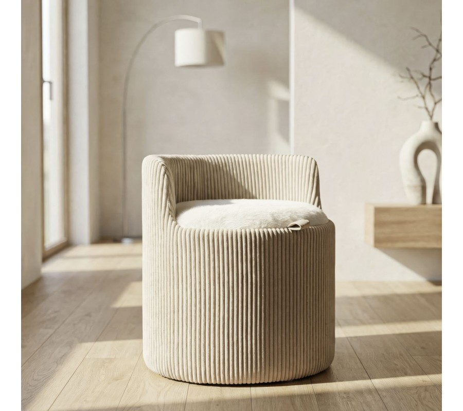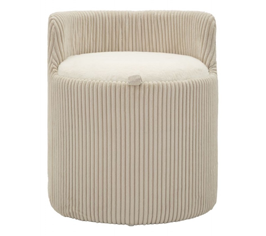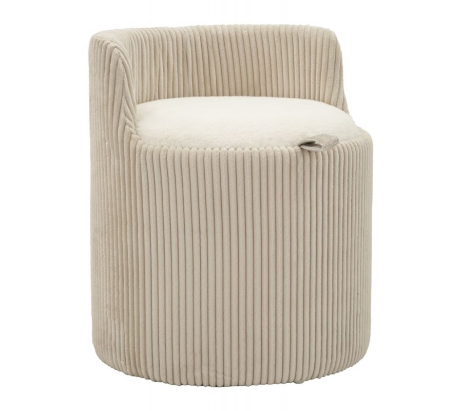 Taburetka Shelly je skvělým doplňkem do moderní ložnice k toaletnímu stolku s podobným drážkovaným zdobením. Díky elegantnímu světlému provedení se hodí i do obývacího pokoje zařízeného ve skandinávském stylu, kde se krásně propojí se světlým masivním dřevem či akcentovou sedačkou v pastelových odstínech.