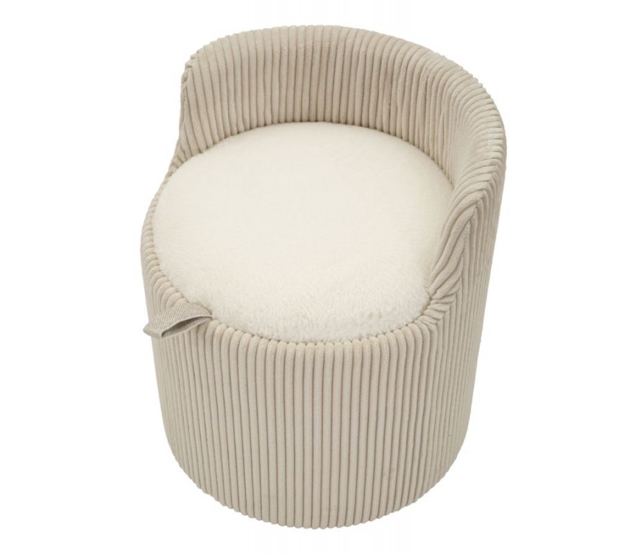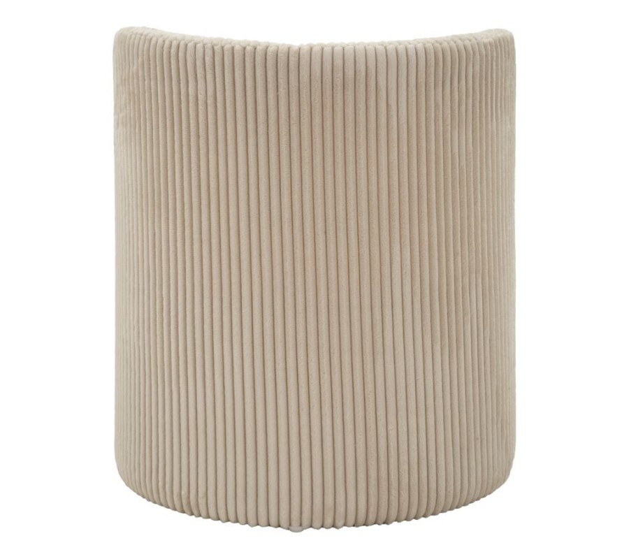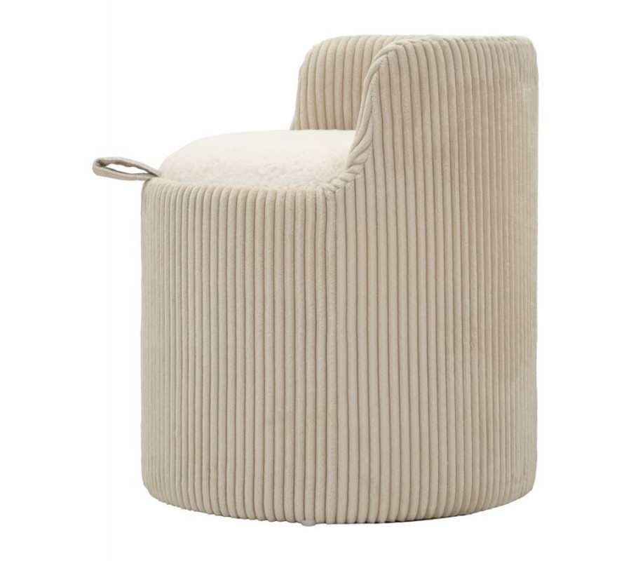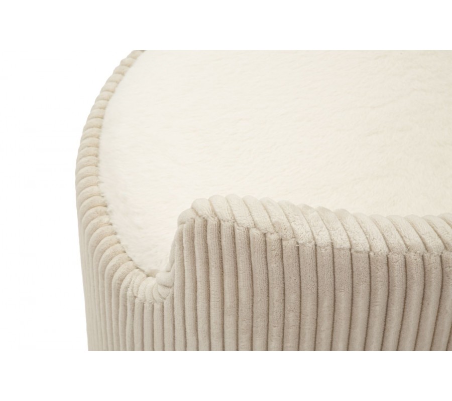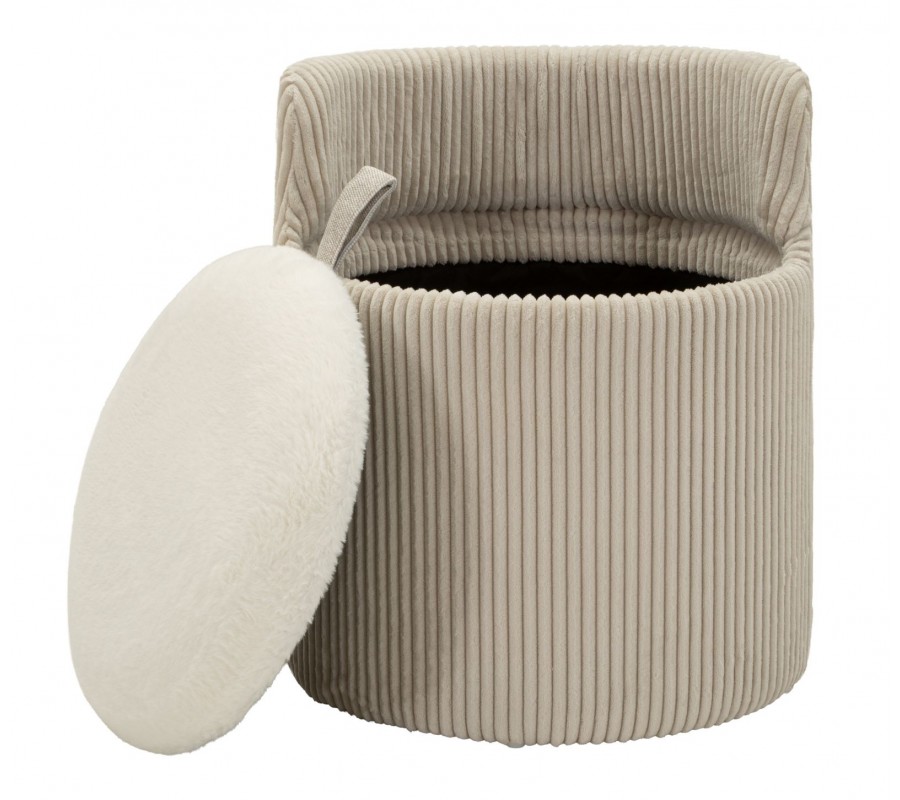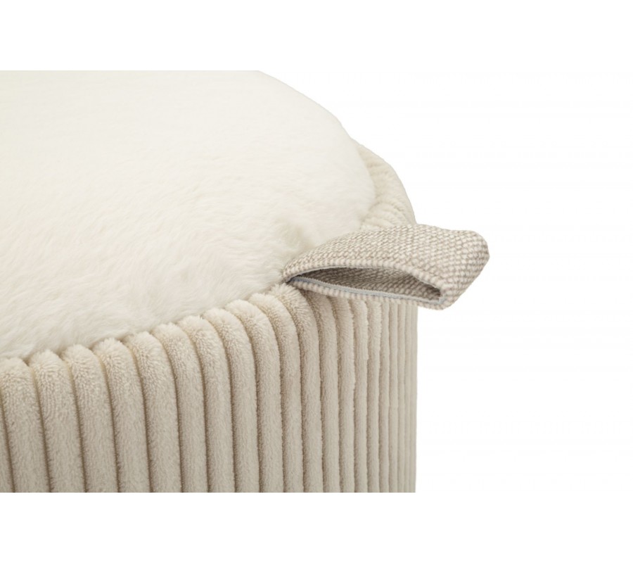 Taburetka má mohutnou válcovitou siluetu bez nožiček. Pevnou dřevěnou konstrukci pokrývá pěnové čalounění a potah z mikrovlákna s plyšovým finišem. Textilie je odolná vůči vlivům každodenního používání, díky vyššímu vlasu je příjemná na dotek a přinese do prostoru teplo působící prvek. Provedení ve světlé béžové barvě design odlehčuje a dodává mu charakteristický skandinávský výraz.