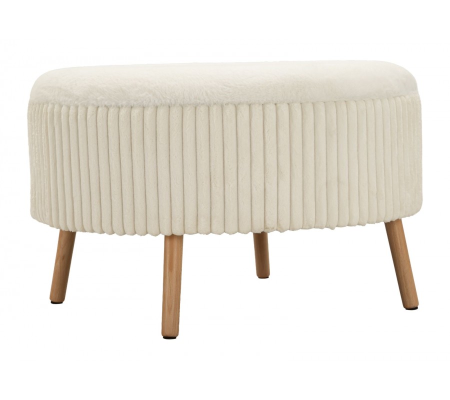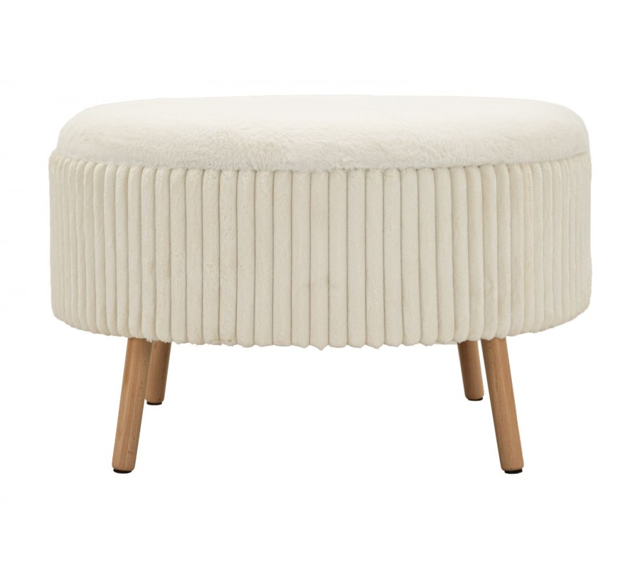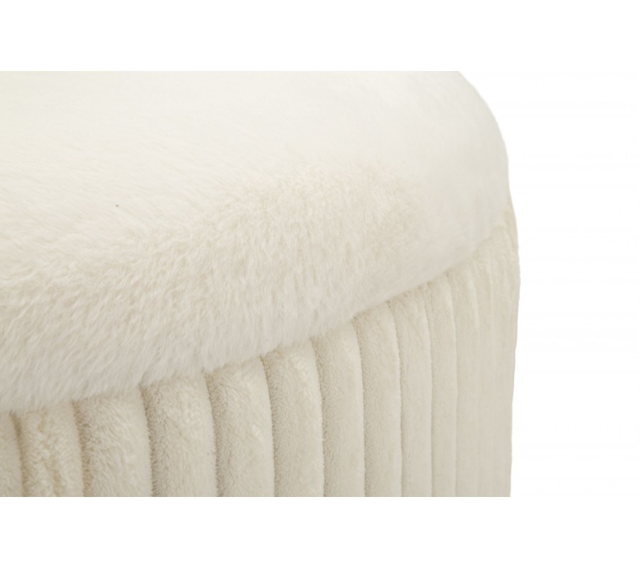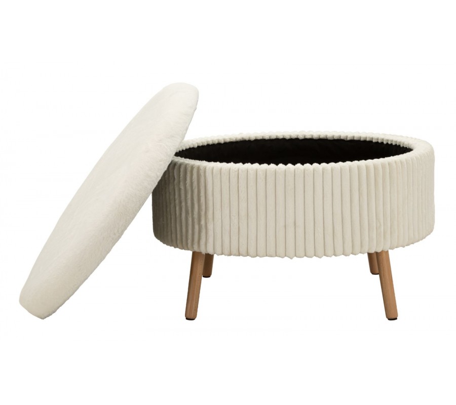 Taburetka je čalúnená príjemnou plyšovou textíliou s vrúbkovaným prešívaním po celom obvode, ktoré ho dodáva vizuálnu strukturu a moderný charakter. Vrchná časť je úplne odnímateľná a pod ňou sa nachádza praktický úložný priestor s černým vnútrom, ideálny na uskladnenie diek, vankúšov, časopisov alebo drobností každodennej potreby.