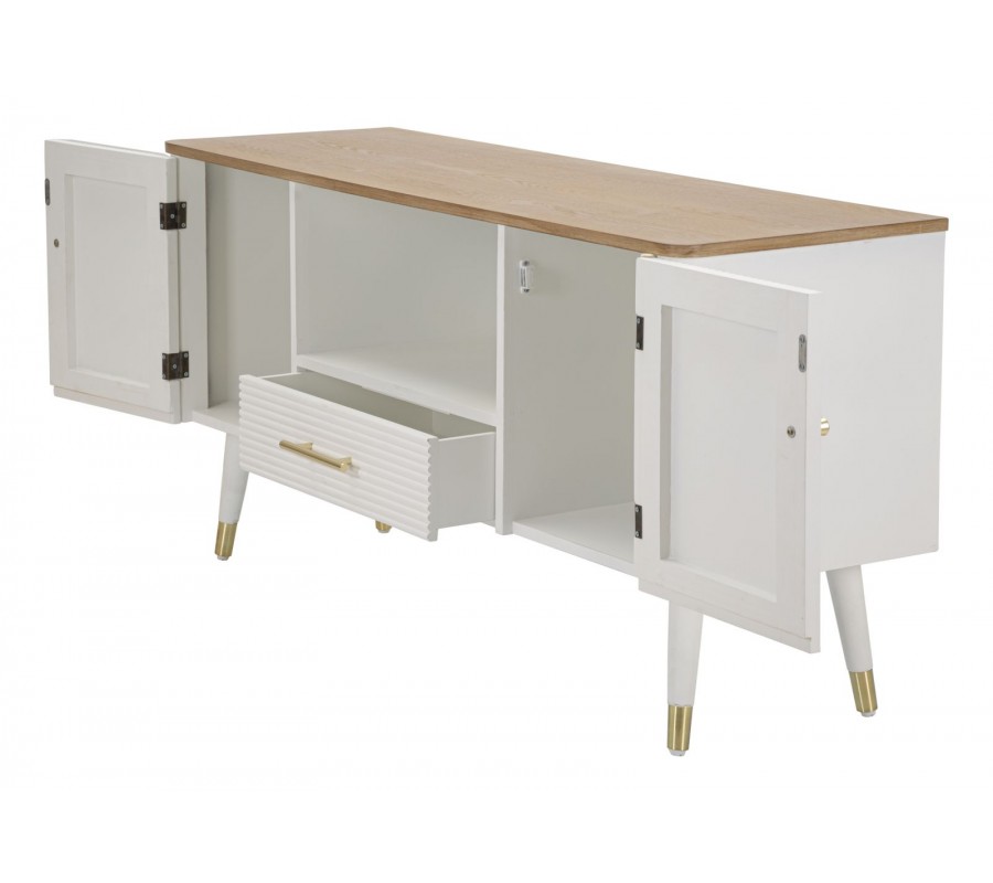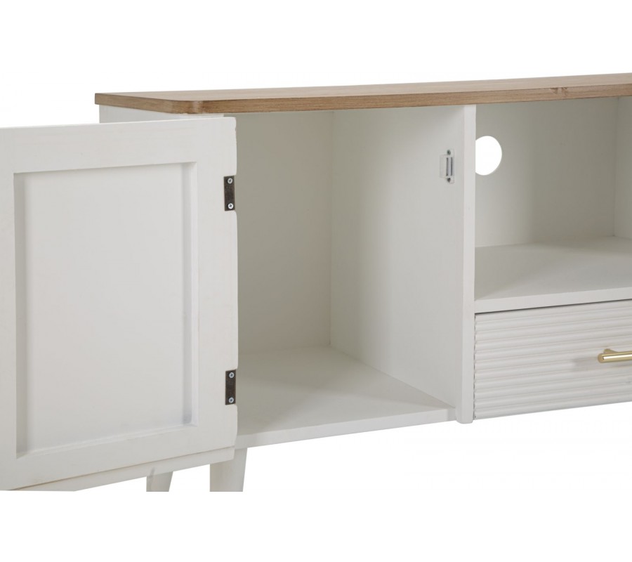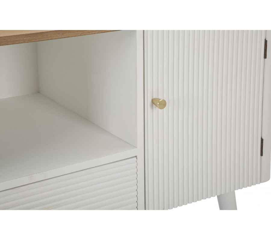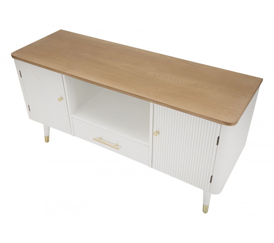 Art deco bílý TV stolek Samira se dvěma dvířky a jednou zásuvkou s vroubkovaným povrchem a hnědou vrchní deskou 117 cm
