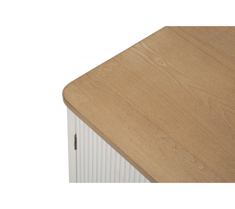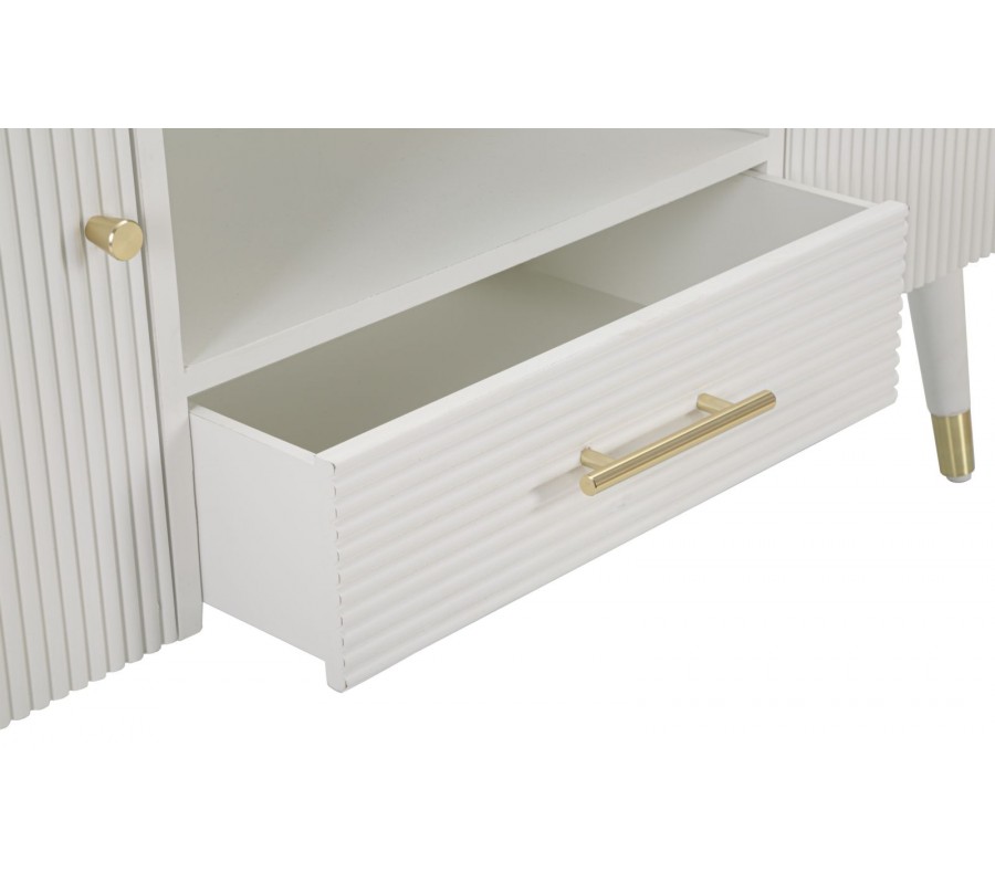 dřeva v bílé barvě, která dodává jeho designu lehkost a elegantní vzhled. Přední plochy stolku jsou zdobeny vroubkovanou strukturou, která zvýrazňuje jeho dekorativní charakter a dodává mu jedinečný vizuální efekt.
