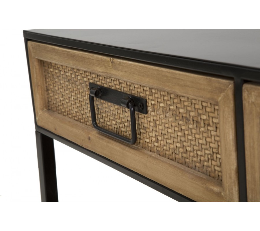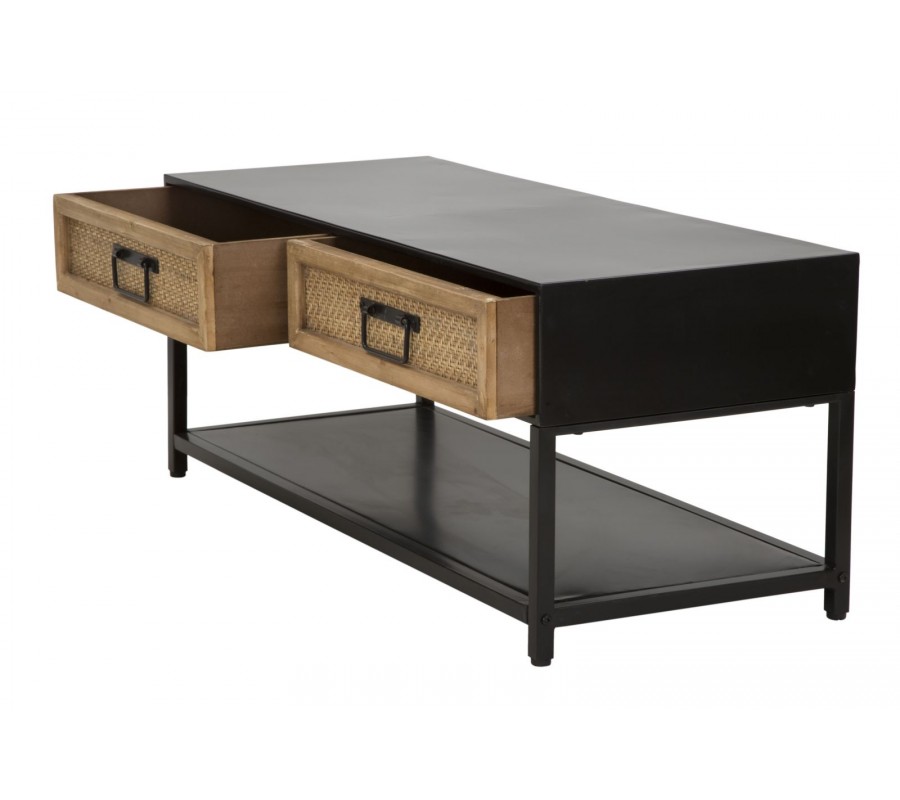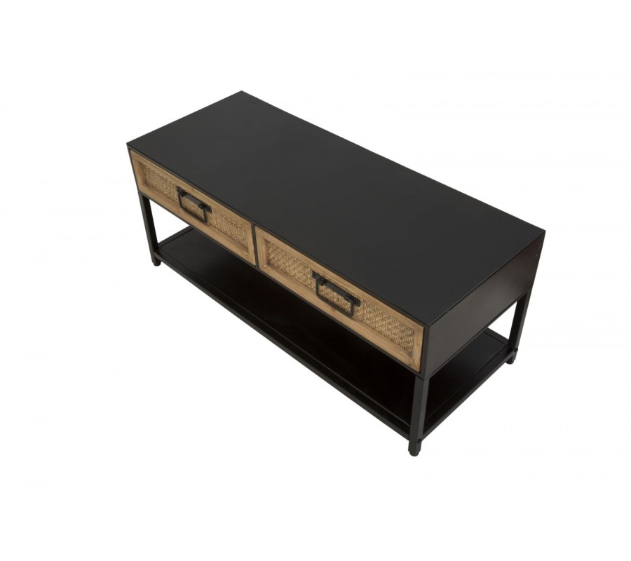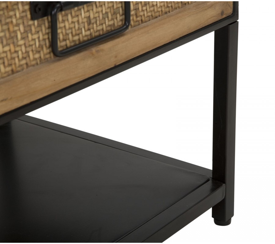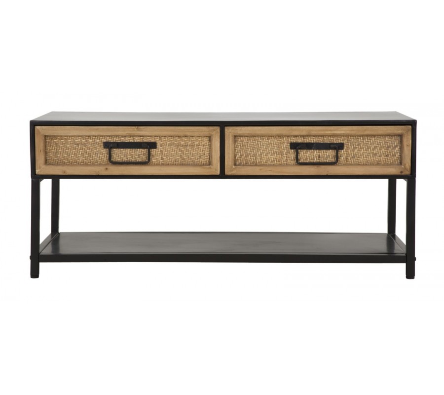 TV stolek v etno stylu Herringbone s obdélníkovým tvarem kombinuje černou. Rám stolku je vyroben z matného černého kovu, což mu dodává stabilitu a moderní industriální vzhled. Dvě praktické zásuvky nabízejí úložný prostor na drobnosti, přičemž jejich čela jsou zdobena výpletem se vzorem rybí kosti herringbone. Černé matné kovové úchyty doplňují design a umožňují pohodlné otevírání.