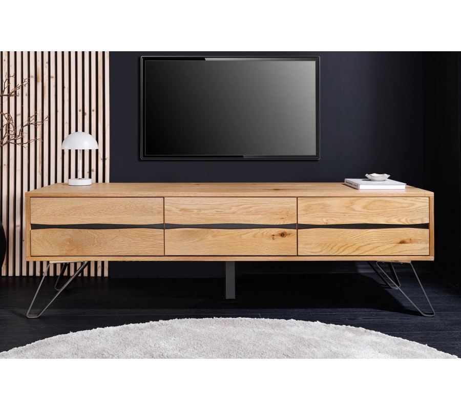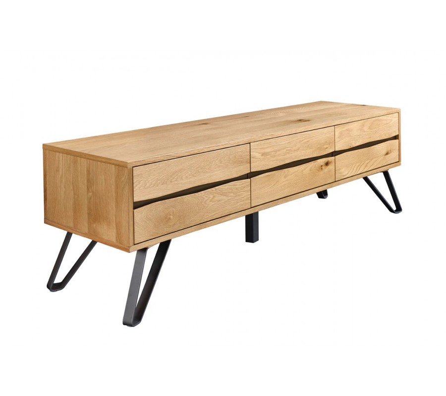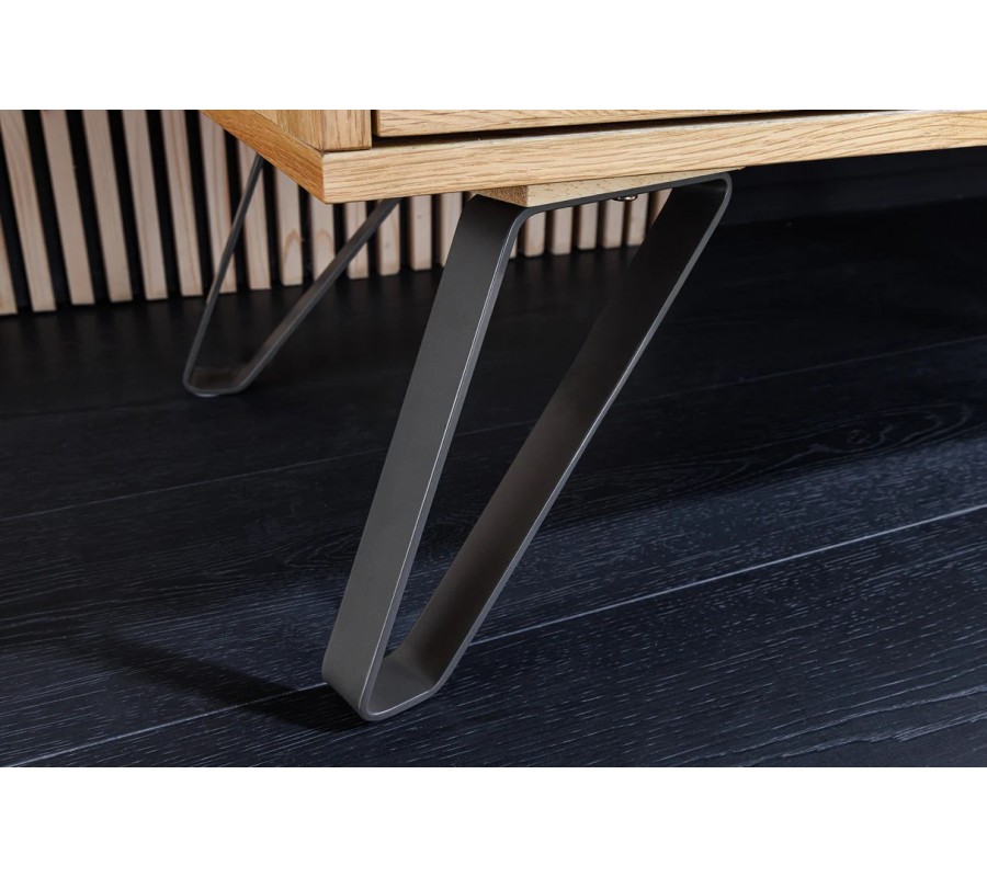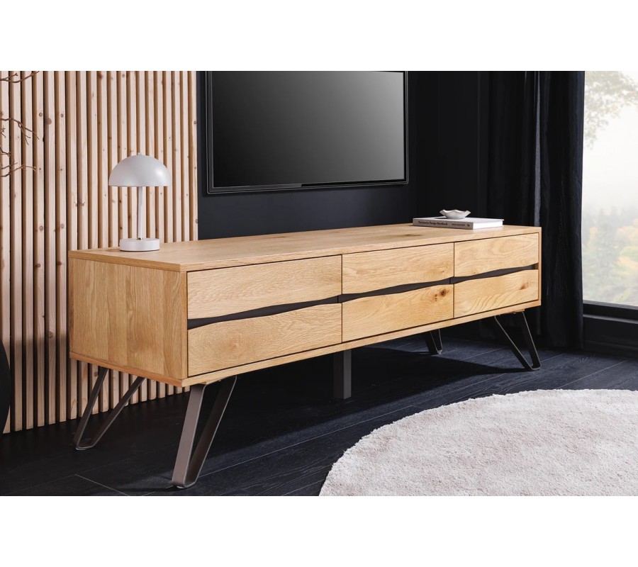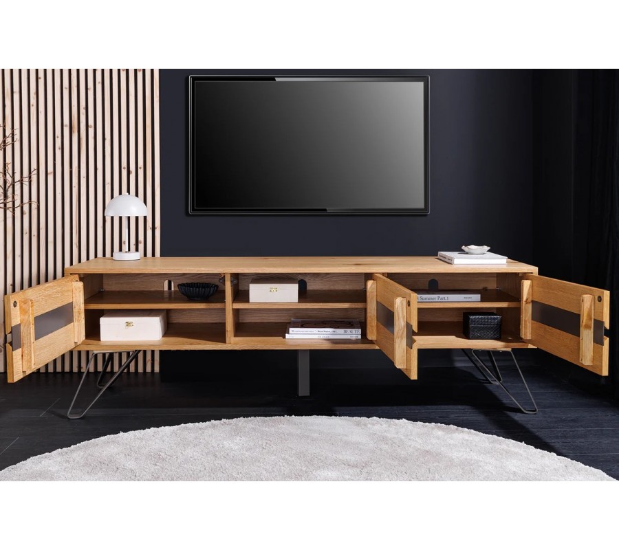 Televizní stolek Andala spojuje přírodní vizuál dubového dřeva s industriálními kovovými prvky v moderním provedení. Oceníte také bohatý úložný prostor.
