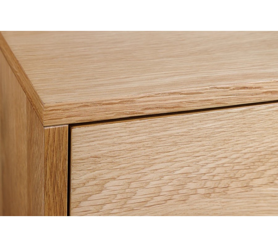 Televizní stolek má obdélníkovou lineární siluetu a korpus je vyroben z dýhovaného dubového dřeva, které mu propůjčuje svoji elegantní světlou hnědou barvu s pravidelnou kresbou letokruhů. Úložný prostor je předělen vertikálními příčkami na tři části. Každá se uzavírá vlastními dvířky a obsahuje dvě policová místa.
