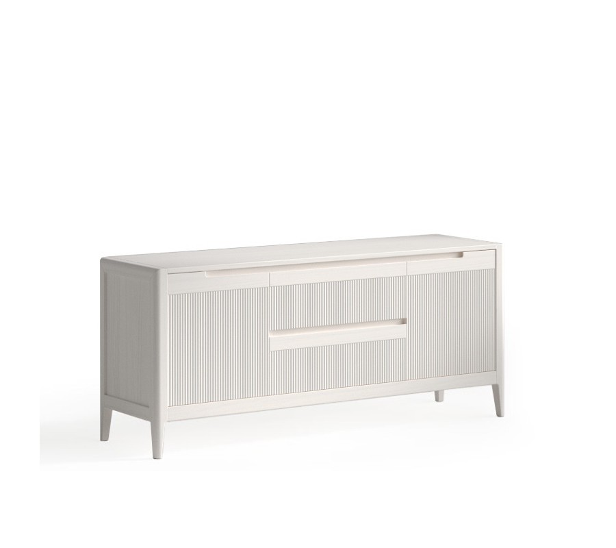 Moderní art deco televizní stolek Tallin z masivního dřeva vyniká jemně vroubkovaným čelem, které mu dodává výrazný charakter a nadčasový vzhled. Dvě boční dvířka nabízejí praktický úložný prostor pro elektroniku, zatímco dvě zásuvky umístěné pod sebou ve středové části slouží k přehlednému uložení drobností. Nízké nožičky jsou z vnitřní strany zkosené, což opticky odlehčuje celkový design a zároveň zachovává stabilitu. Stolek se hodí do moderních, art deco i přírodně laděných obýváků a výborně se kombinuje s čalouněnými sedačkami, kovovými doplňky nebo dalším masivním nábytkem ve stejném stylu.