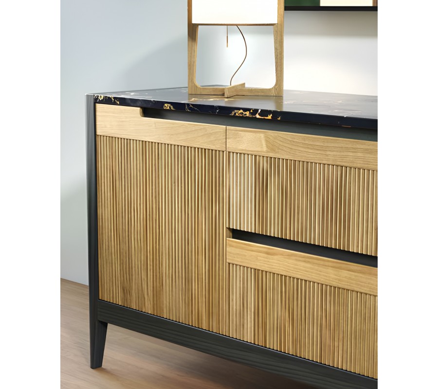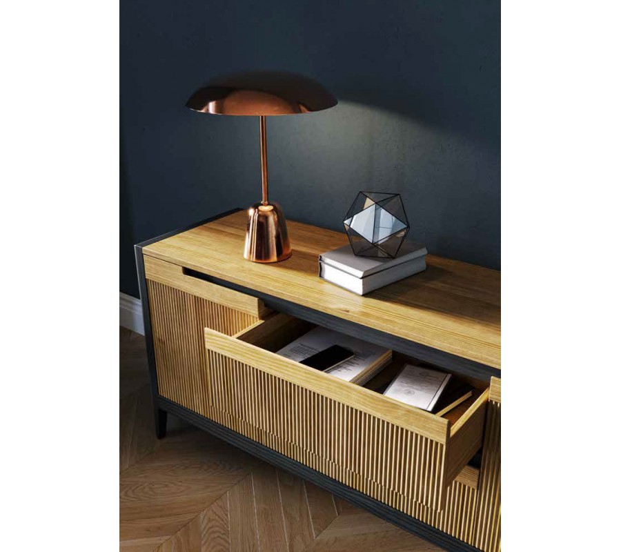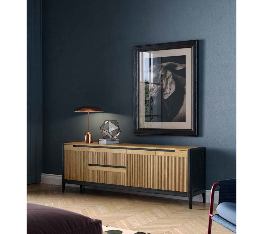 Luxusní moderní TV stolek Tallin z dubového dřeva je výrazným designovým kusem, který spojuje moderní eleganci s jemným vintage nádechem a precizním zpracováním detailů. Má obdélníkový tvar se zaoblenými bočními hranami, díky čemuž působí měkce, harmonicky a vizuálně vyváženě. Povrch dřeva je ošetřen jemně opotřebovanou patinou, která dodává nábytku hloubku, charakter a nadčasový vzhled bez rušivého efektu. Stolek je členěn na troje dvířka – jedny na levé straně a dvoje na pravé straně – a dvě zásuvky umístěné uprostřed, což vytváří praktické a přehledné uspořádání úložného prostoru. Přední strana dvířek i zásuvek je zpracována vertikálním vroubkováním, které dodává povrchu bohatou texturu a typický designový rukopis kolekce Tallin. Dvířka i zásuvky mají integrované výřezy v horní části u vrchní desky, sloužící jako nenápadné úchyty, přičemž tyto výřezy jsou zvýrazněny černou barvou. Barevná kombinace je elegantně kontrastní – hnědá jsou přední dvířka, zásuvky a vrchní deska, zatímco černé jsou boční strany, nožičky a detaily výřezů. Nožičky jsou nízké a z vnitřní strany jemně zkosené, což stolku dodává lehkost, stabilitu a moderní architektonický výraz.
