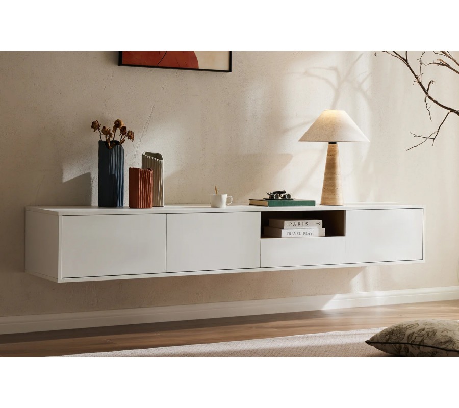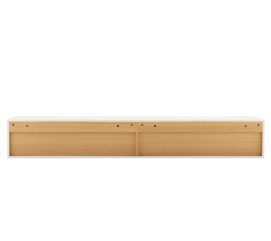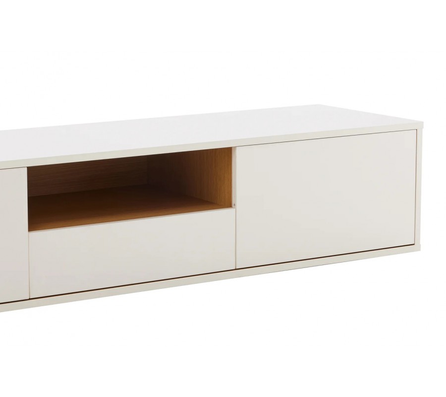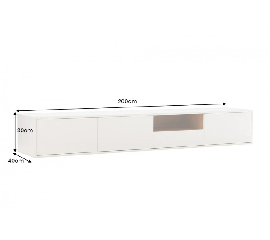 Skandinávský nástěnný obdélníkový třídveřový TV stolek Attica ze dřeva v bílé barvě se zásuvkou 200 cm