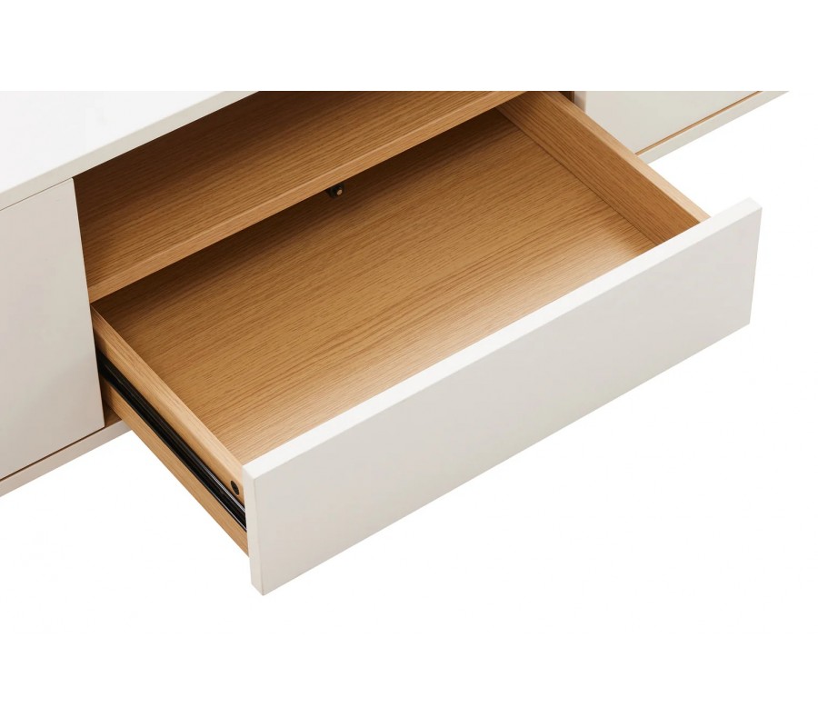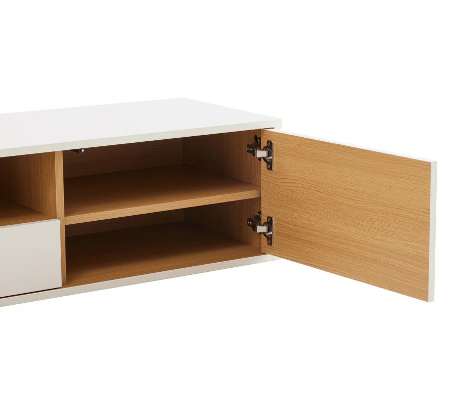 Na levé straně se nachází uzavíratelná skříňka se dvěma dvířky, jejíž vnitřek je prakticky rozdělen vertikální deskou a dvěma policemi. Tento prostor je ideální pro uložení elektroniky, dokumentů nebo domácích doplňků. Pravá část stolku nabízí skříňku s jedněmi dvířky a jednou policí, doplněnou o zásuvku a otevřenou polici nad ní, která je vhodná pro přehrávače, herní konzole či dekorační předměty. Černé vnitřek stolku vytváří elegantní kontrast s bílým exteriérem a dodává nábytku moderní, sofistikovaný akcent.