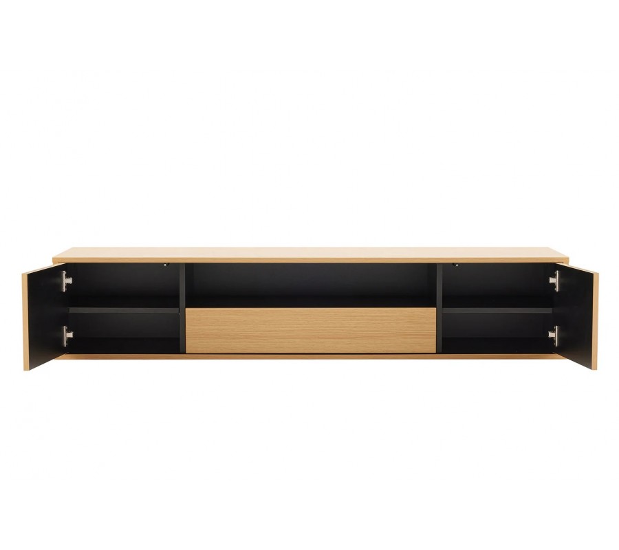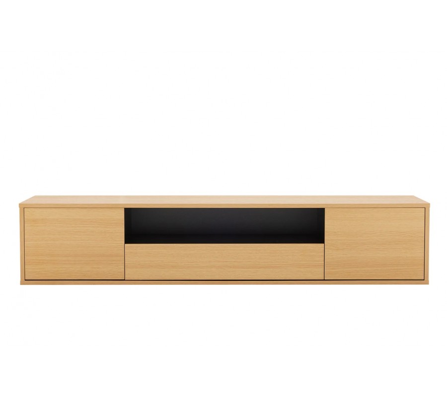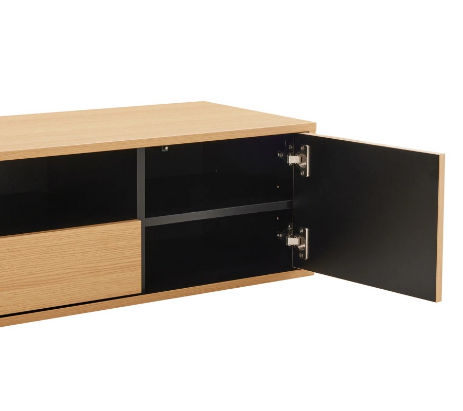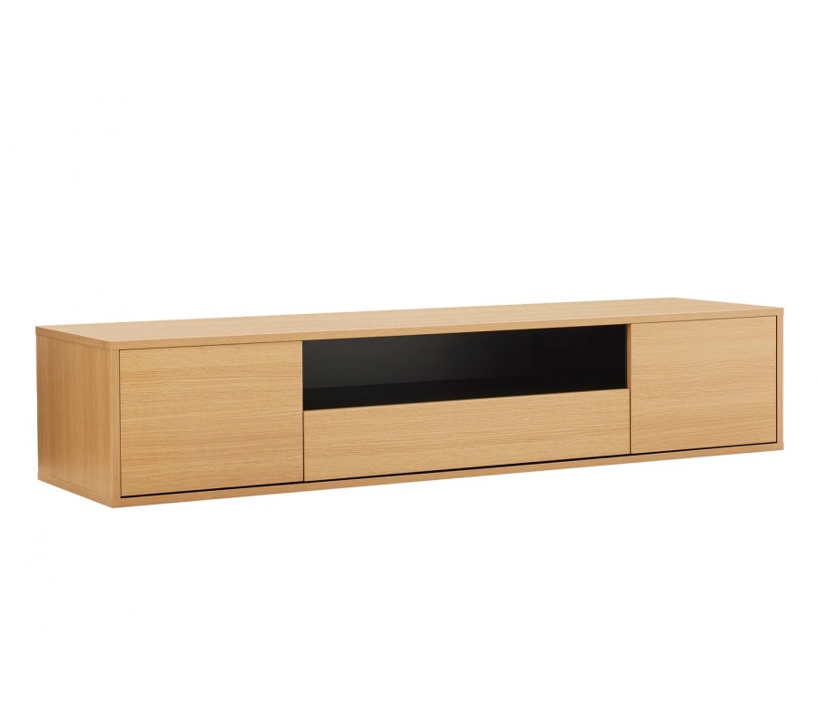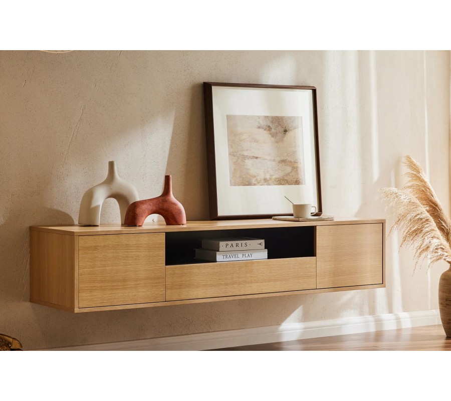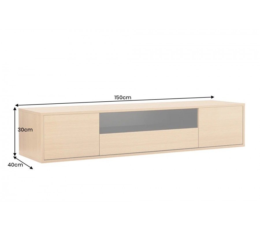 Skandinávský dvoudveřový obdélníkový závěsný TV stolek Attica s dubovým hnědým vzhledem se zásuvkou a policí 150 cm
