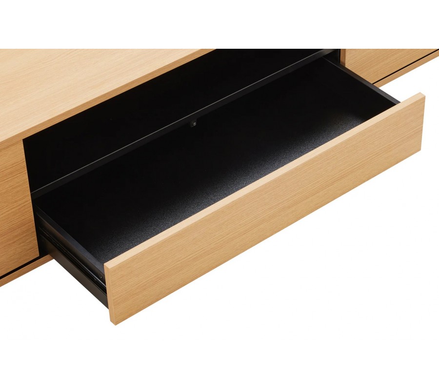 Moderní skandinávský TV stolek Attica v dubovém vzhledu je elegantním a praktickým řešením pro současné obývací prostory, kde je kladen důraz na jednoduchost, funkčnost a přirozené materiály. Obdélníkový tvar a čisté linie působí nadčasově a snadno, přičemž teplý dubový dekor vnáší do interiéru pocit útulnosti a přirozené harmonie. Skříňky jsou umístěny na obou krajích stolku a každá z nich ukrývá jednu polici, vhodnou pro uložení elektroniky, doplňků či dokumentů. Ve střední části se nachází zásuvka a nad ní otevřená police, ideální pro média, herní konzole nebo dekorace. Černý vnitřek stolku vytváří moderní kontrast ke světlému dřevěnému vzhledu a dodává nábytku sofistikovaný detail.