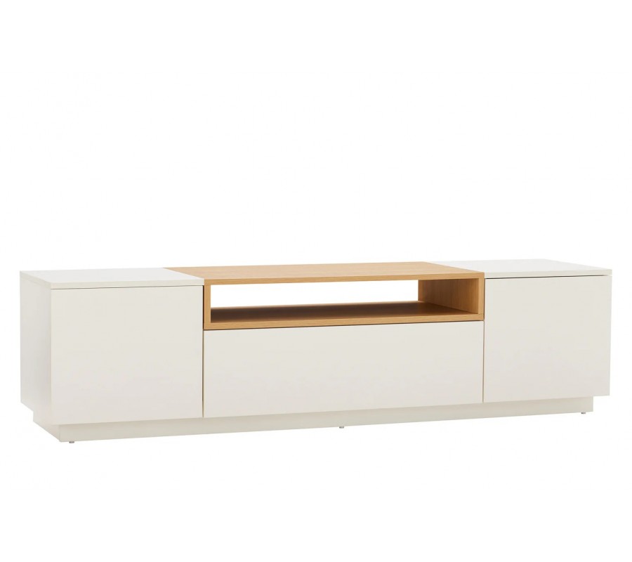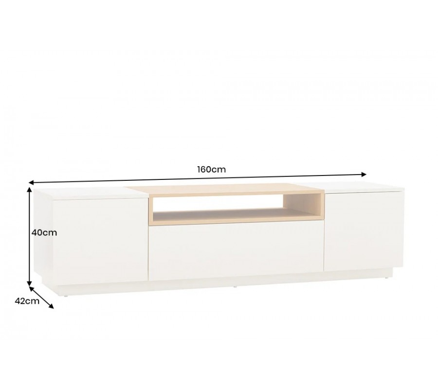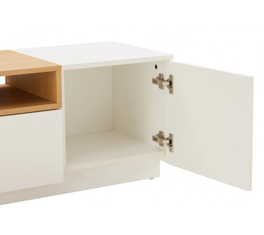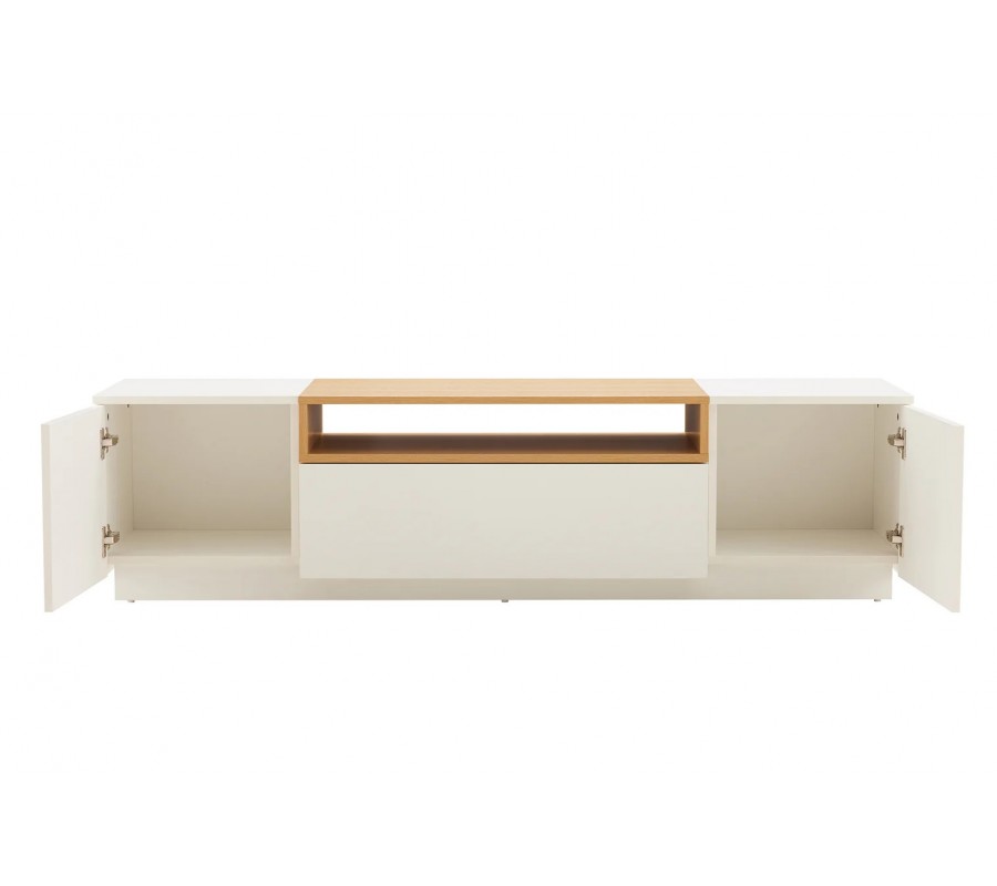 Skandinávský obdélníkový dvoudveřový TV stolek Attica v bílé barvě se zásuvkou a dubovou policí 160 cm