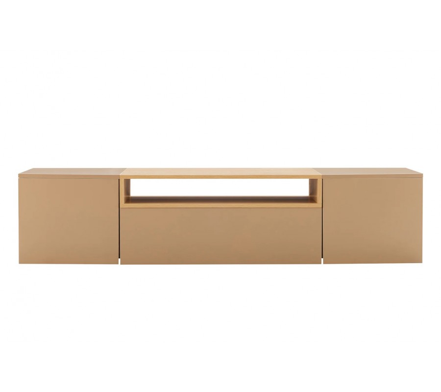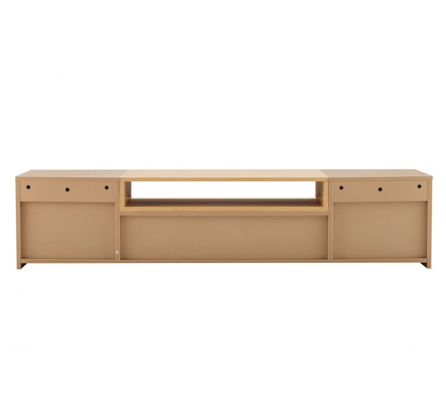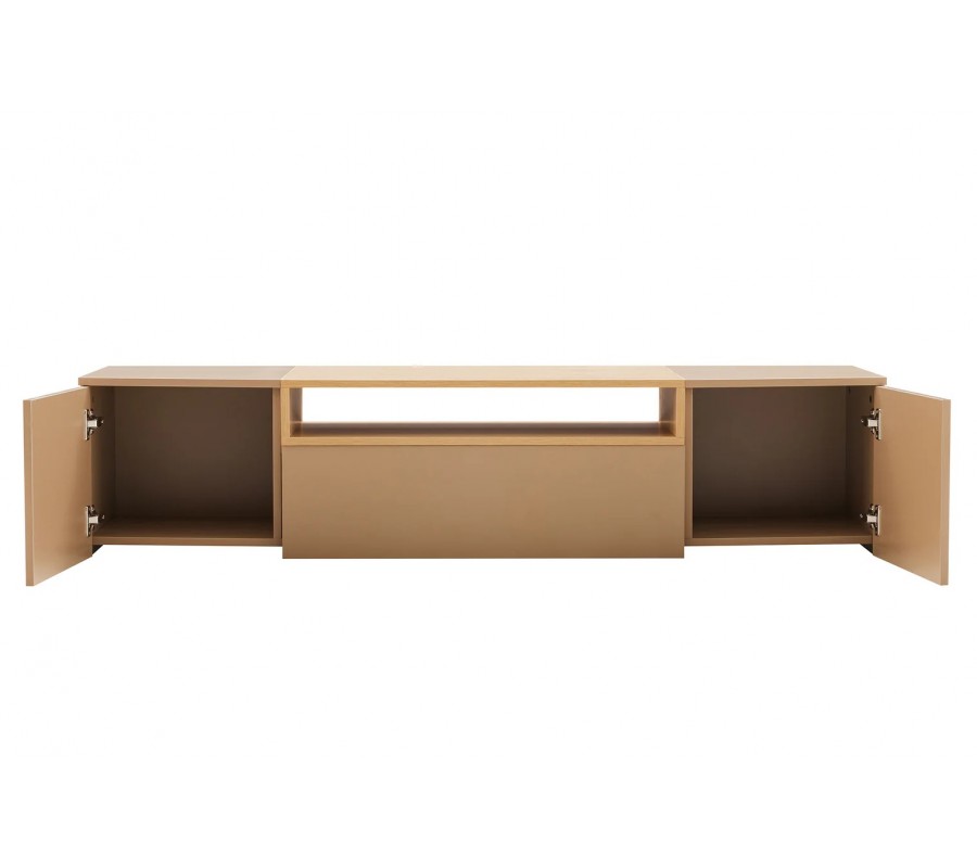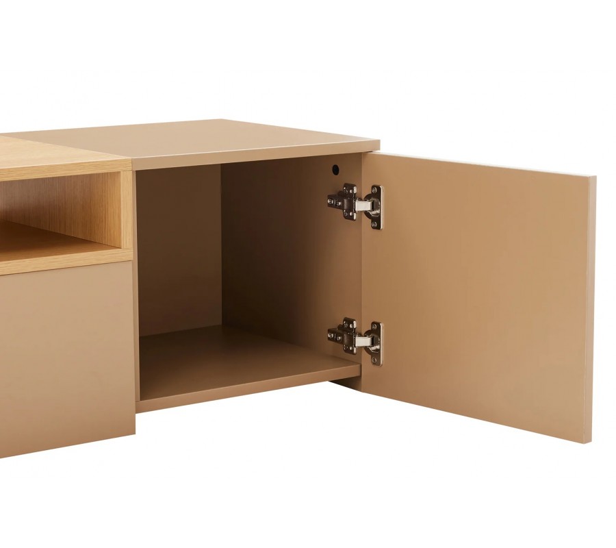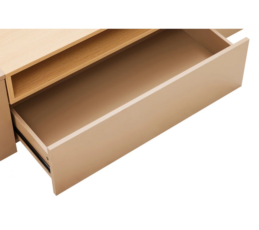 Na obou krajích stolku se nacházejí uzavíratelné skříňky, které poskytují dostatek úložného prostoru pro elektroniku, příslušenství nebo předměty, které chcete mít skryté. Ve střední části je praktická zásuvka a nad ní otevřená police v dubovém vzhledu, která nemá zadní stěnu. Toto řešení je ideální pro vedení kabelů a umístění zařízení, jako jsou set-top boxy, herní konzole či přehrávače, bez rušivého vizuálního efektu. Vnitřek stolku je v hnědé barvě, což zachovává jednotný a harmonický vzhled celého nábytku.