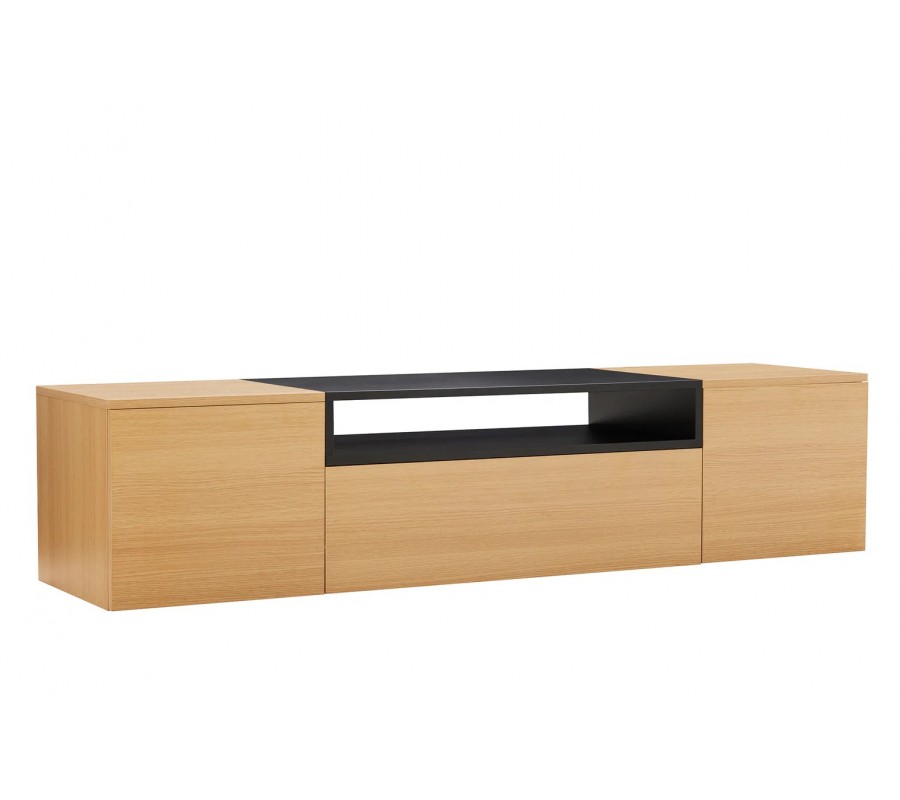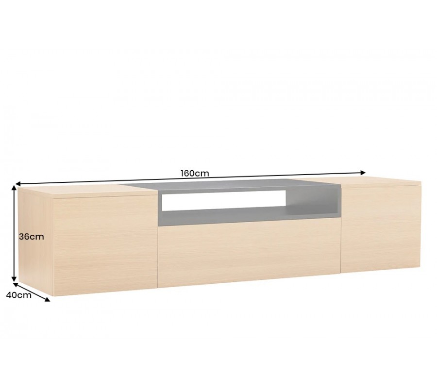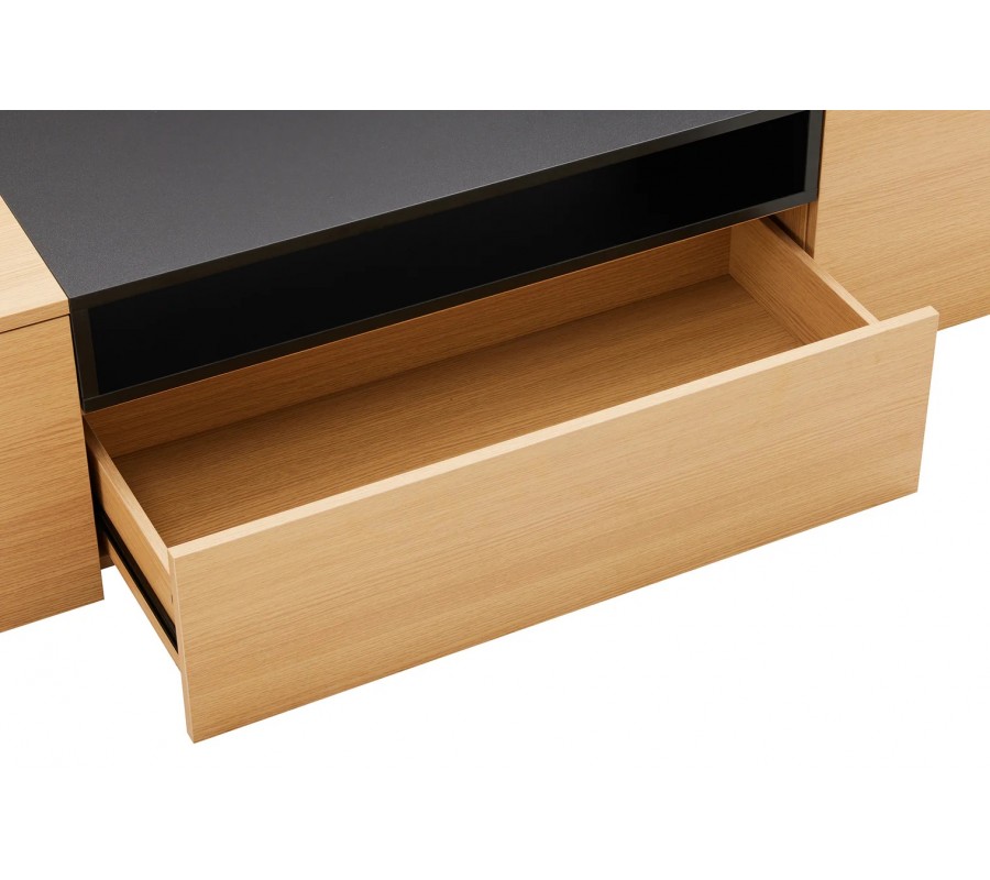 Na obou krajích stolku se nacházejí uzavíratelné skříňky, které poskytují praktický úložný prostor pro elektroniku, příslušenství nebo předměty, které chcete mít skryté. Ve střední části je umístěna zásuvka a nad ní otevřena police v černé barvě. Tato police nemá zadní stěnu, díky čemuž je ideální pro vedení kabelů a umístění zařízení, jako jsou set-top boxy, herní konzole nebo přehrávače. Kontrastní černá police elegantně zvýrazňuje střed stolku a dodává celému designu moderní akcent. Vnitřek stolku je v hnědém provedení, což zachovává teplý a jednotný vzhled.