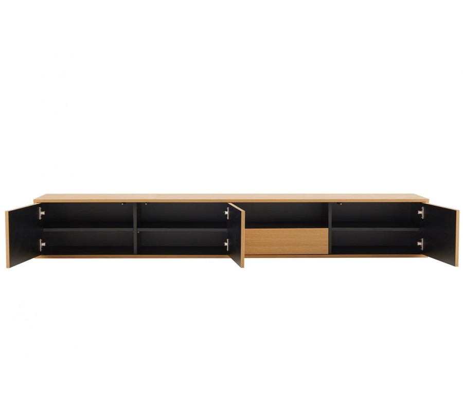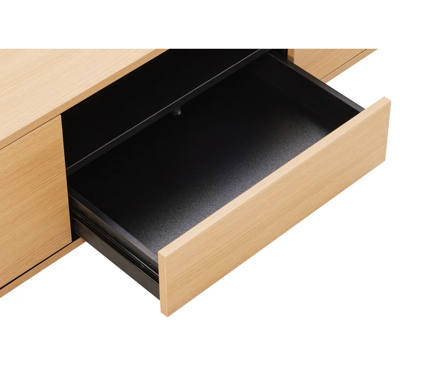 Moderní skandinávský TV stolek Attica je elegantním a funkčním kusem nábytku, který vyniká čistými liniemi, přirozeným dubovým vzhledem a promyšleným vnitřním uspořádáním. Obdélníkový tvar působí snadno a vzdušně, díky čemuž stolek nepůsobí masivně ani ve větších prostorách. Na levé straně se nachází uzavíratelná skříňka se dvěma dvířky, jejíž vnitřek je prakticky rozdělen vertikální deskou a dvěma policemi doplňky. Pravá část stolku nabízí skříňku s jedněmi dvířky a jednou policí. Vedle skříňky je zásuvka a otevřená polici nad ní, ideální na média, herní konzole nebo dekorace. Černý vnitřek stolku vytváří moderní kontrast ke světlému dřevěnému provedení a dodává celku sofistikovaný vzhled.