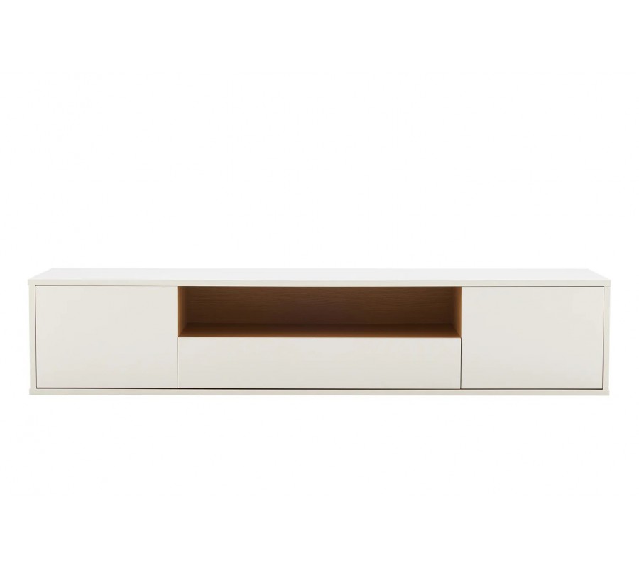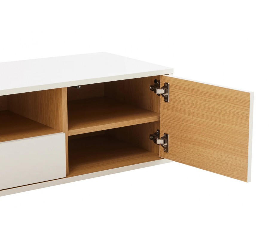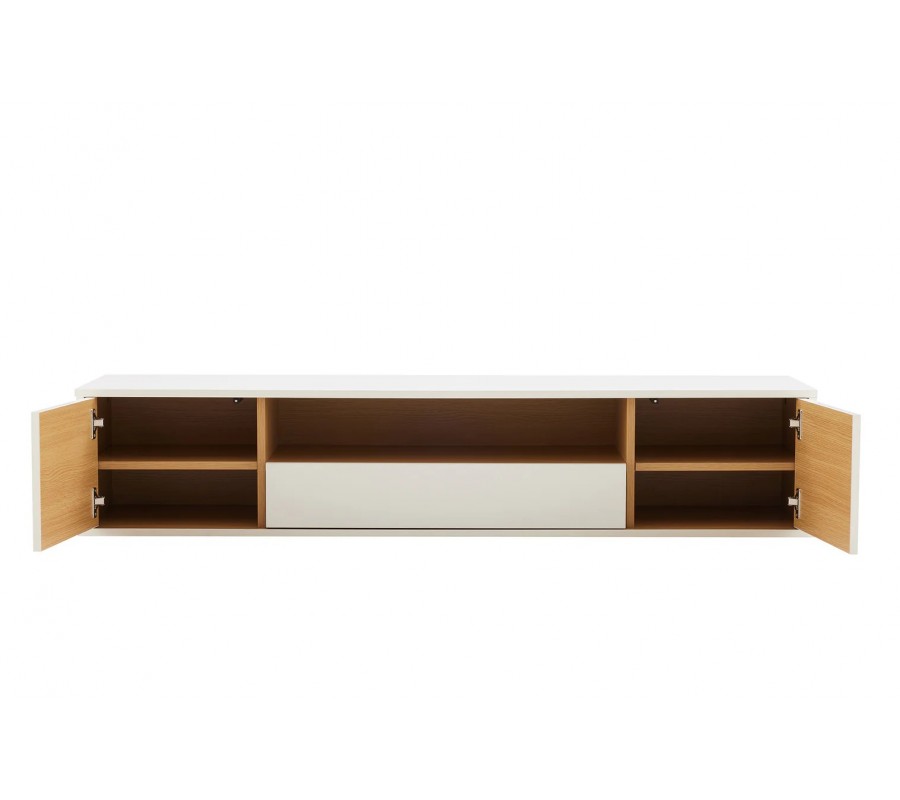 Na krajích stolku se nacházejí dvěuzavíratelné skříňky, z nichž každá ukrývá jednu polici, vhodnou pro uložení elektroniky, dokumentů nebo drobných předmětů. Ve střední části se nachází praktická zásuvka a nad ní otevřená police s dubovou dýhou a zadní stěnou, která je ideální pro uložení médií, set-top boxu nebo dekorací. Vnitřní plochy v dubovém dekoru působí útulně a designově propracovaně i při otevřených částech stolku.