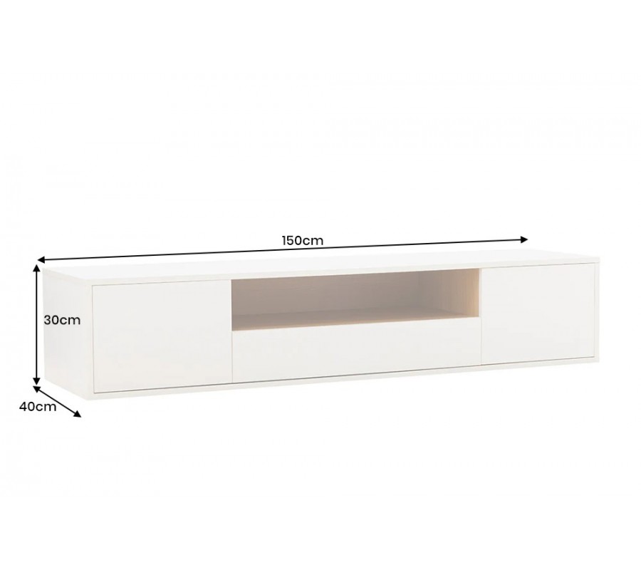 Moderní obdélníkový nástěnný bílý dvoudveřový TV stolek Attica se šuplíkem a hnědou poličkou 150 cm