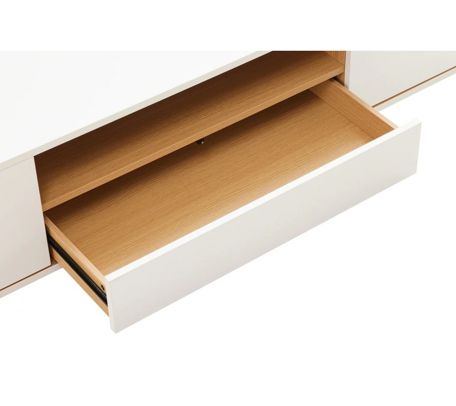 Na krajích stolku se nacházejí dvě uzavíratelné skříňky, z nichž každá ukrývá jednu polici, vhodnou pro uložení elektroniky, dokumentů nebo drobností. Ve střední části je praktická zásuvka a nad ní otevřená police s dubovým vzhledem, která nemá zadní stěnu, takže umožňuje snadné vedení kabelů od TV či audio techniky. Vnitřek stolku v dubovém dekoru působí útulně a zároveň designově propracovaně i při otevřených částech.