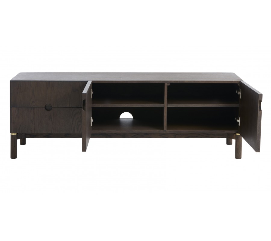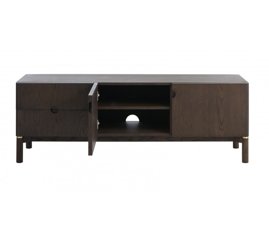 Uvnitř skříňky se nachází otvor pro vedení kabelů, umístěný uprostřed, což umožňuje snadné zapojení televizoru, přehrávačů či herních konzol bez viditelných kabelů. Stolek stojí na nižších válcovitých nožičkách, které opticky odlehčují jeho robustnější korpus. Navrchní části nožiček se nachází jemný detail ve zlatém kovovém vzhledu, který dodává nábytku elegantní akcent a decentní luxusní charakter.