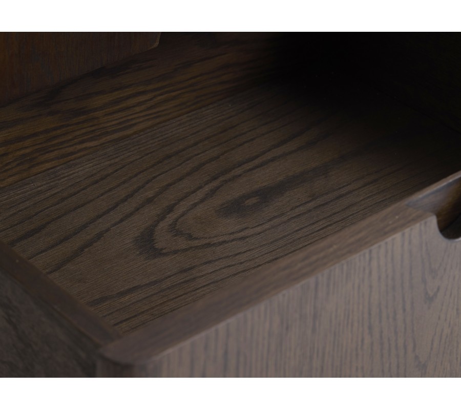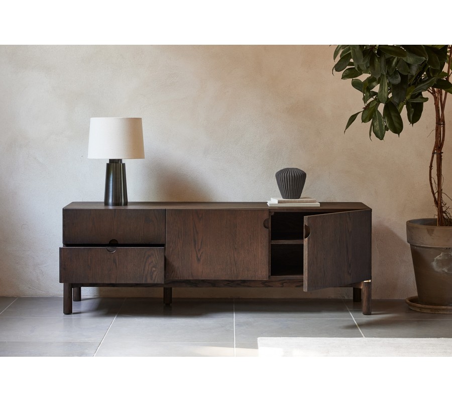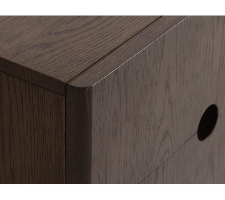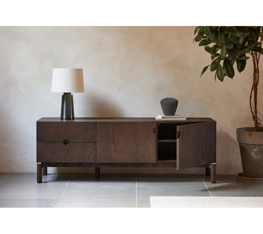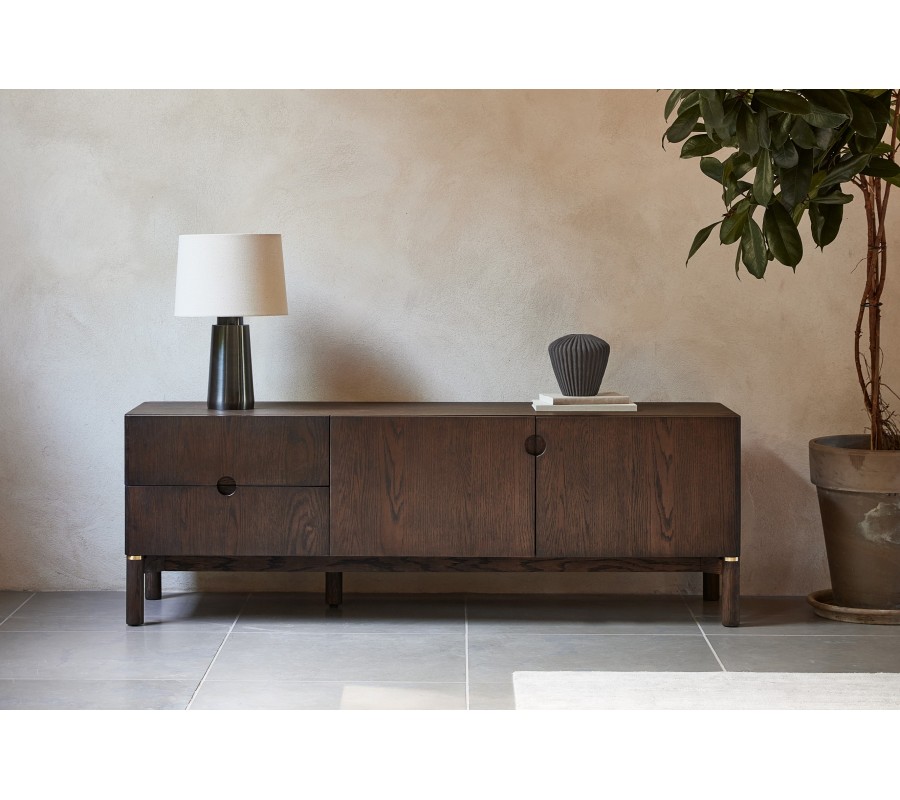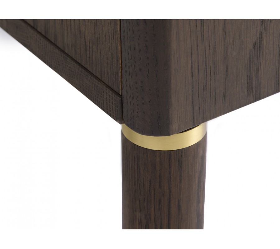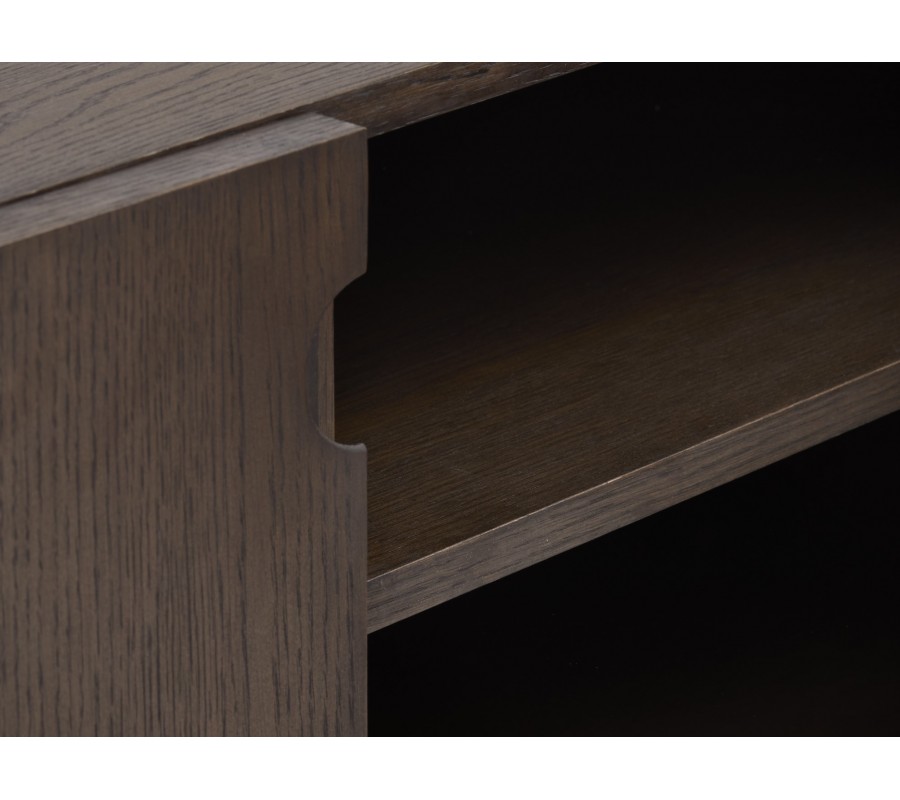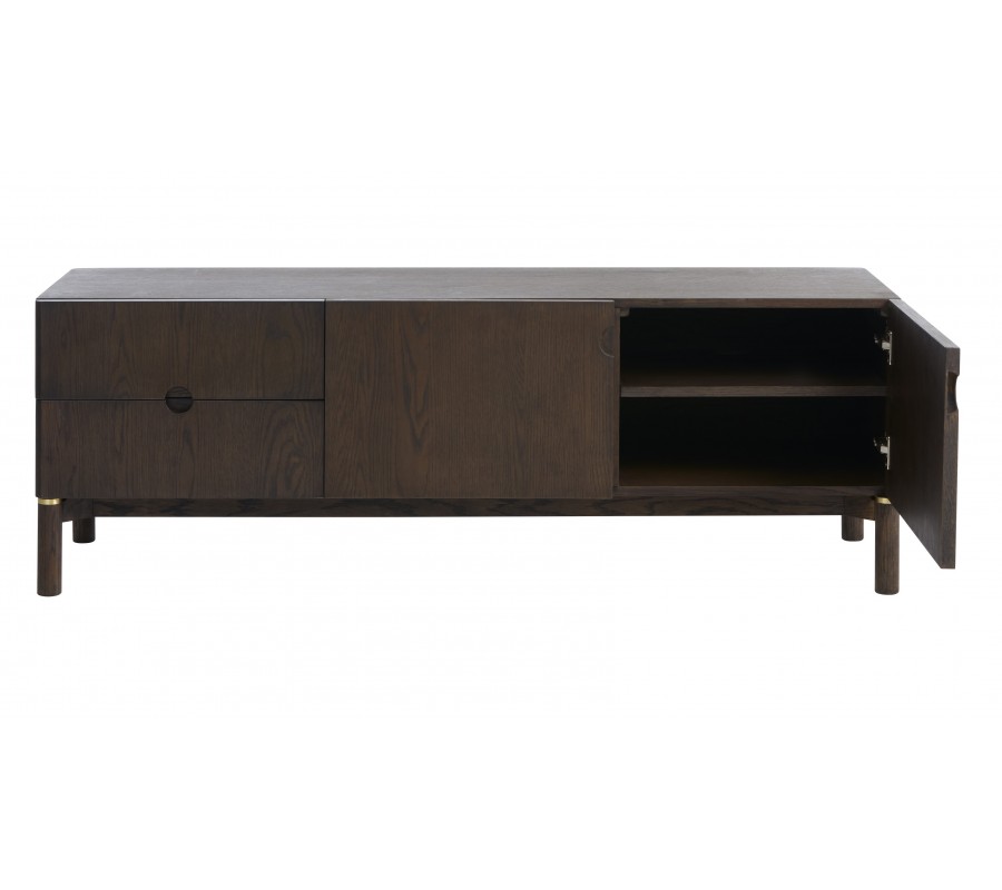 Moderní TV stolek Linia zaujme elegantním minimalistickým designem s jemným nádechem stylu art deco a kvalitním zpracováním v tmavém dřevěném odstínu. Má obdélníkový tvar a je vyhotoven z kombinace dubové dýhy, masivního dubového dřeva a MDF v tmavě hnědé barvě, jejíž přirozená kresba dodává nábytku hloubku a sofistikovaný charakter. Rovné linie a hladké plochy nechávají vyniknout krásu materiálu i promyšlené detaily.