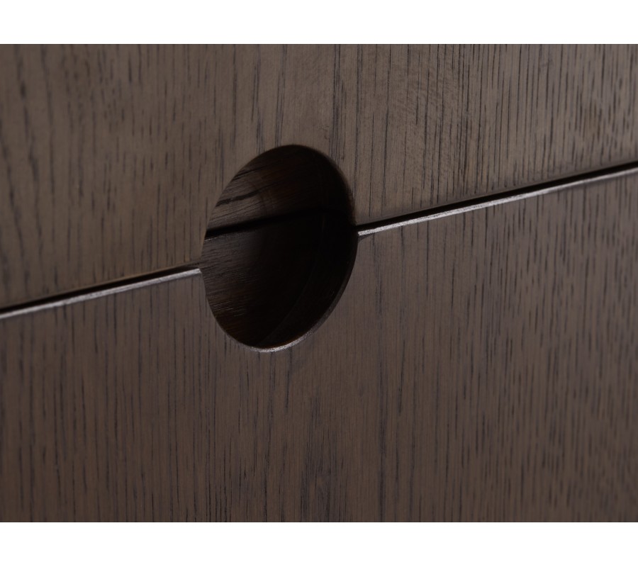Přední část stolku tvoří praktická kombinace dvou zásuvek na levé straně a dvou dvířek na pravé straně. Úchytky jsou řešeny minimalisticky – uprostřed čel zásuvek i dvířek se nachází kulatý vyřez, který slouží jako rukojeť. Tento detail působí moderně a zároveň dekorativně. Za dvířky se nachází úložný prostor prodělený jednou policí, která umožňuje přehledné uspořádání elektroniky, dokumentů nebo drobných doplňků.