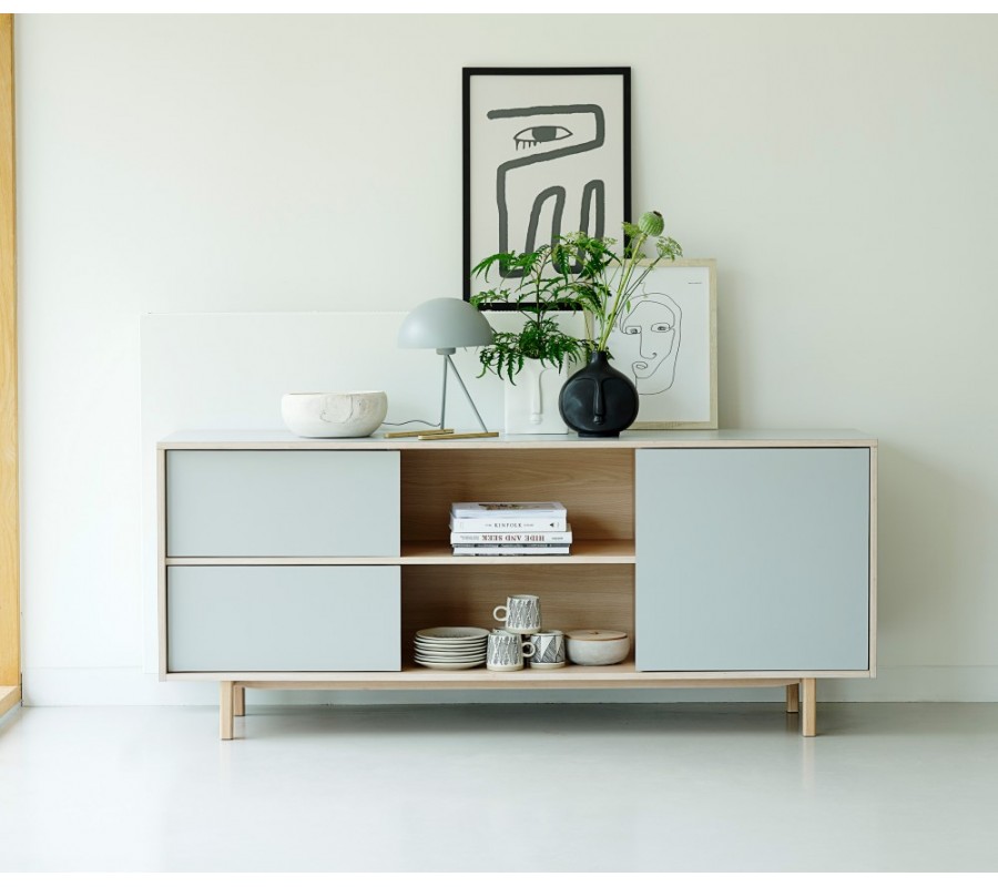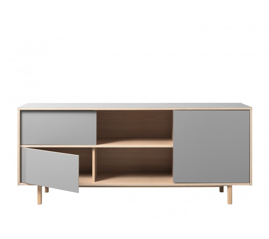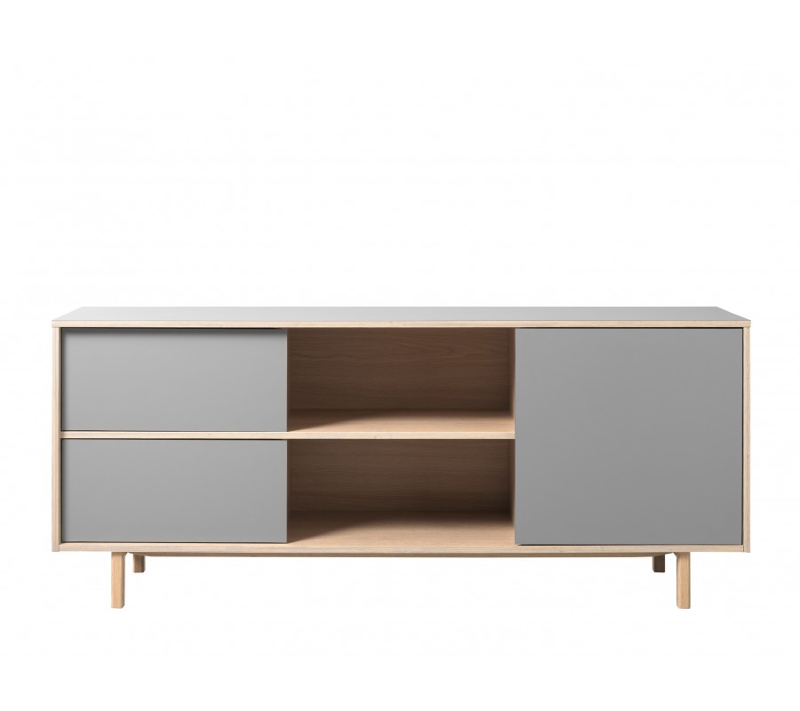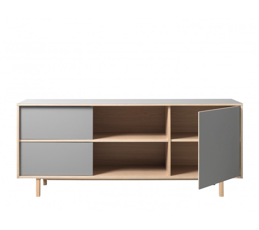 Stolek má obdélníkový tvar a stojí na jednoduchých dřevěných nožičkách, které mu dodávají typický severský vzhled a zároveň opticky odlehčují jeho siluetu. Přední část je řešena asymetricky a nabízí praktické členění úložného prostoru. Na levé straně se nacházejí dvě dvířka umístěná nad sebou, ve středu je otevřený prostor s dvěmi policemi nad sebou, ideální pro multimediální zařízení, a na pravé straně jsou jedny větší dvířka, za který.