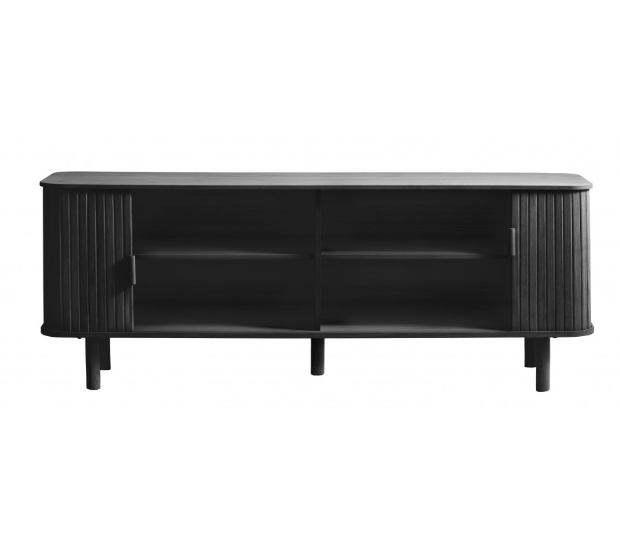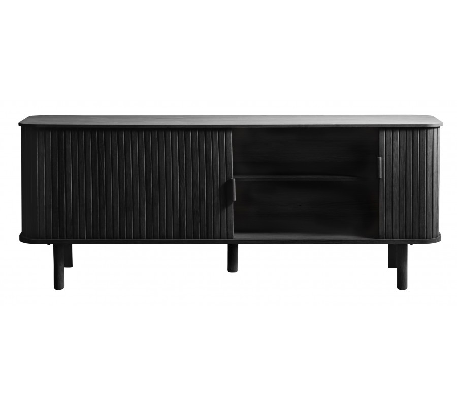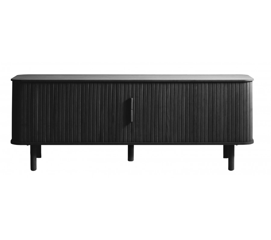 Designový retro černý TV stolek Elbe s dvojitými lamelovými posuvnými dvířky a úložným prostorem se čtyřmi policemi 160 cm
