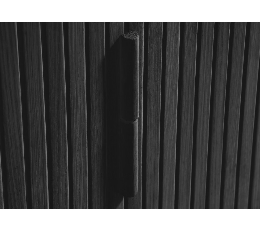 Výrazným prvkem jsou posuvná dvířka, která čerpají inspiraci z retro designu 50. let. Jejich povrch tvoří vertikální lamely, díky kterým plynule splývají s korpusem a vytváří zajímavý vizuální detail. Válcovité úchyty, osazené v rozdílných výškách, se při zavření dvířek zarovnají do jedné linie.