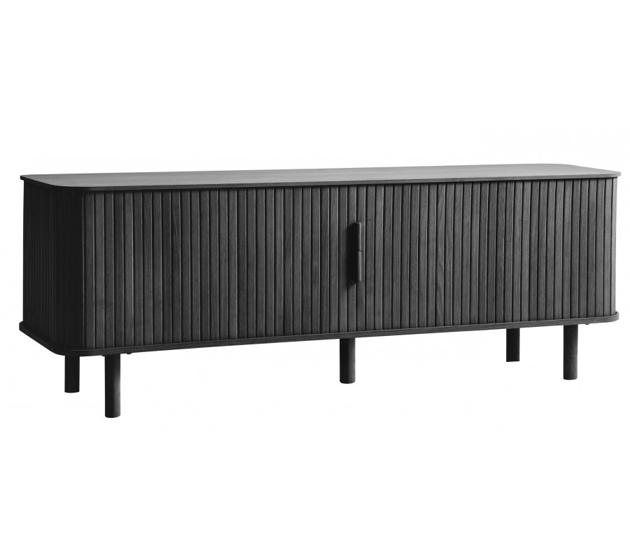 Designový retro černý TV stolek Elbe s dvojitými lamelovými posuvnými dvířky a úložným prostorem se čtyřmi policemi 160 cm