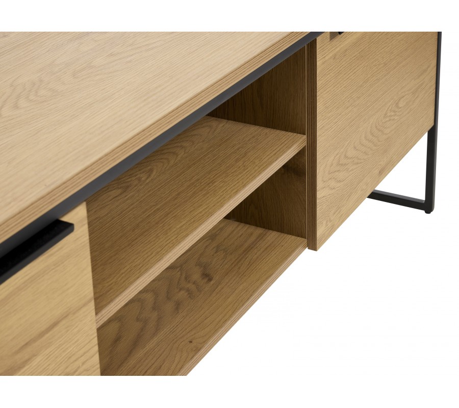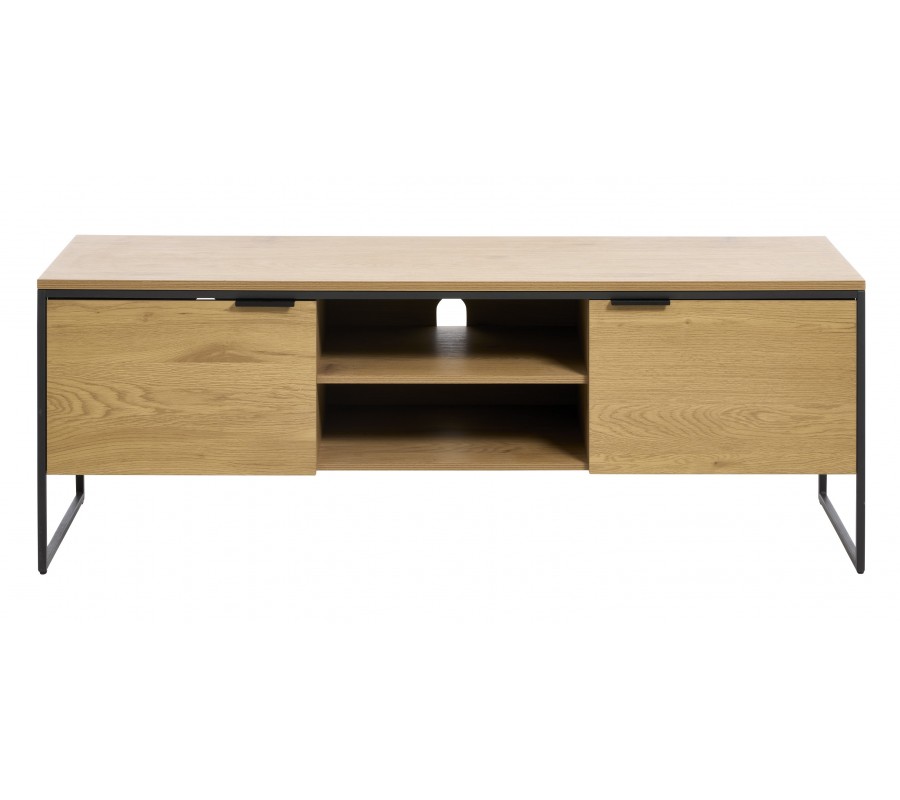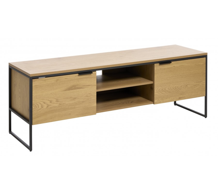 Moderní TV stolek Holstebro se dvěma dvířky a policemi v dubovém hnědém provedení s černými kovovými detaily 155 cm
