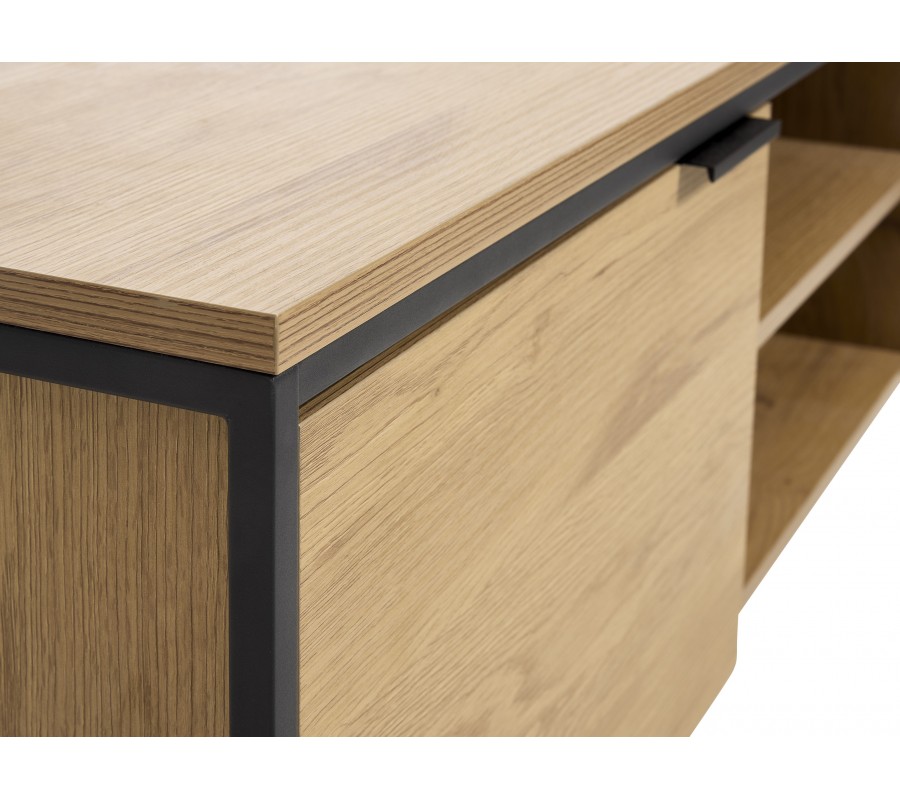 Rovné minimalistické linie vrchní části zdůrazňuje kovový rám, lemující obvod bočních stran a vrchní hranu přední strany. Přechází až do nožek ve tvaru U. Jeho štíhlé linie působí odlehčeně a černá barva vytváří stylový kontrast k teplému charakteru dřeva.