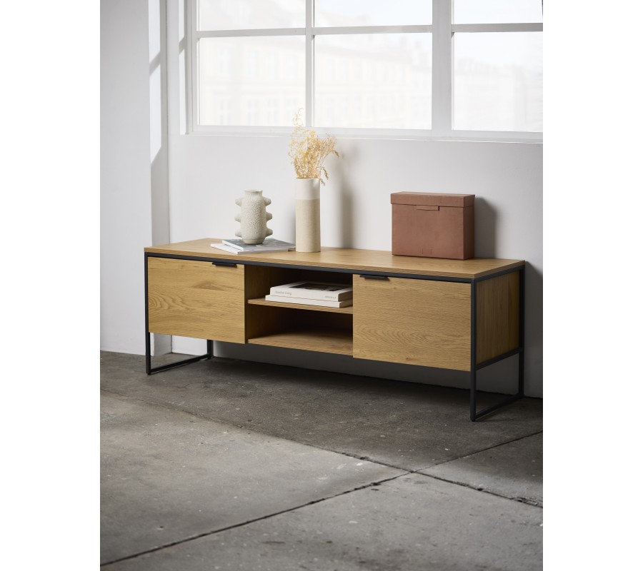 Televizní stolek Holstebro spojuje moderní minimalismus a nádechem industriální estetiky. Oceníte také bohatý úložný prostor.