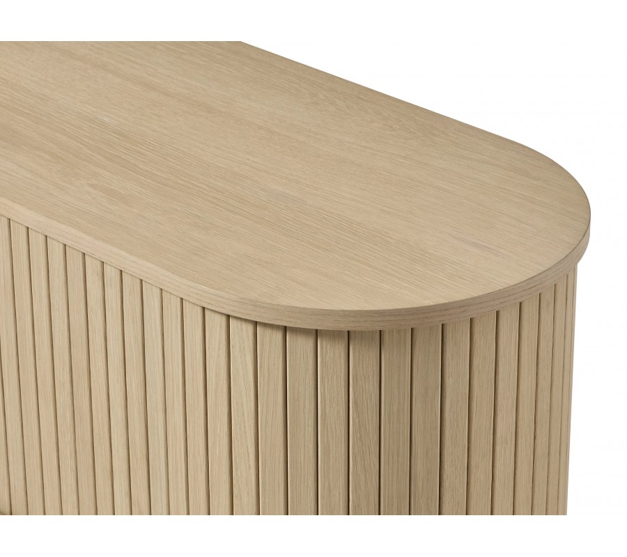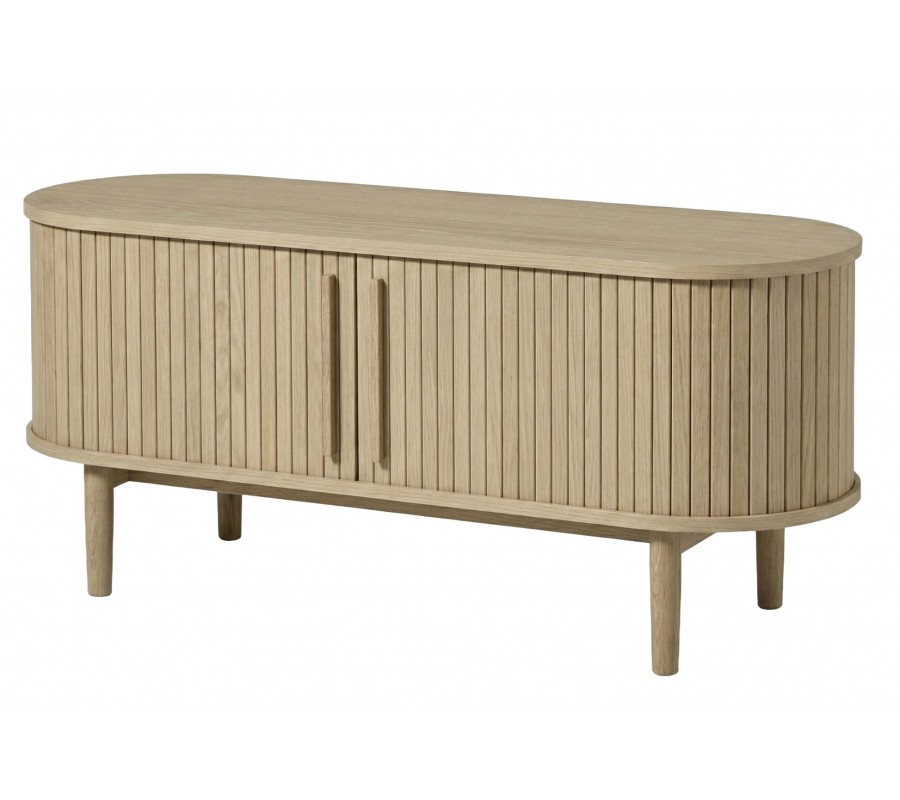 Skandinávský oválný TV stolek Alborg s posuvnými lamelovými dvířky ve světlém hnědém dubovém provedení 140 cm