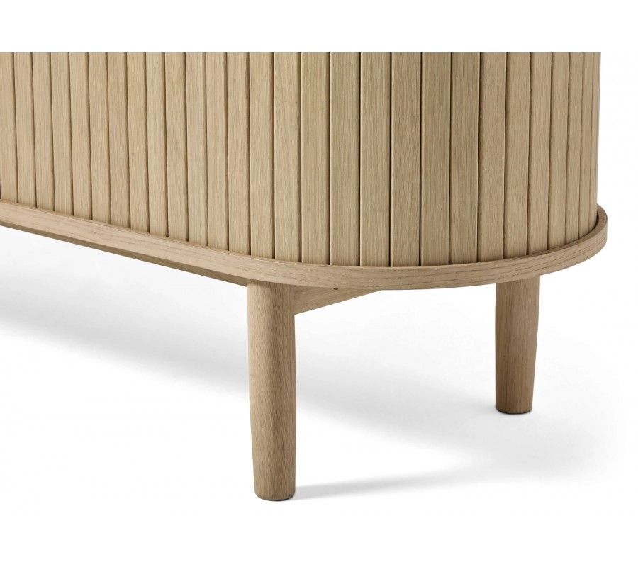 Skandinávský oválný TV stolek Alborg s posuvnými lamelovými dvířky ve světlém hnědém dubovém provedení 140 cm
