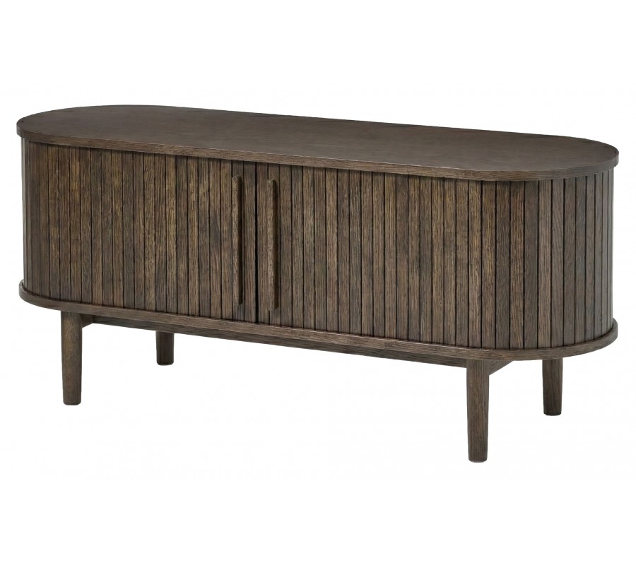 Retro oválný dvoudveřový TV stolek Alborg s lamelovým designem v tmavém hnědém dubovém provedení 140 cm