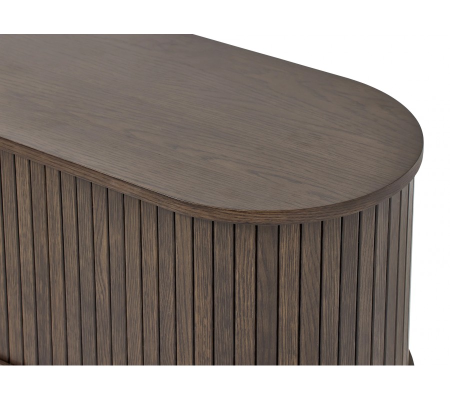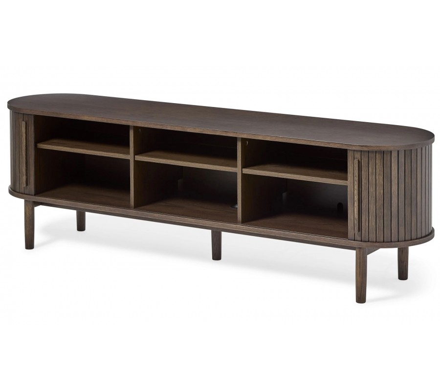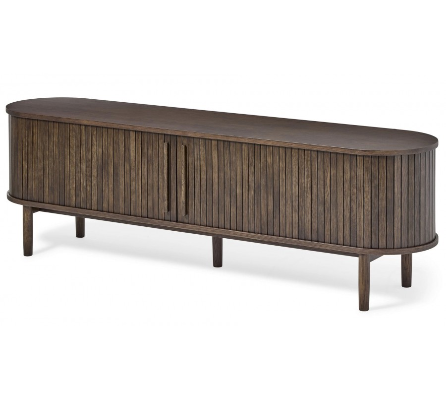 Retro oválný TV stolek Alborg s posuvnými lamelovými dvířky v tmavém hnědém dubovém provedení 180 cm