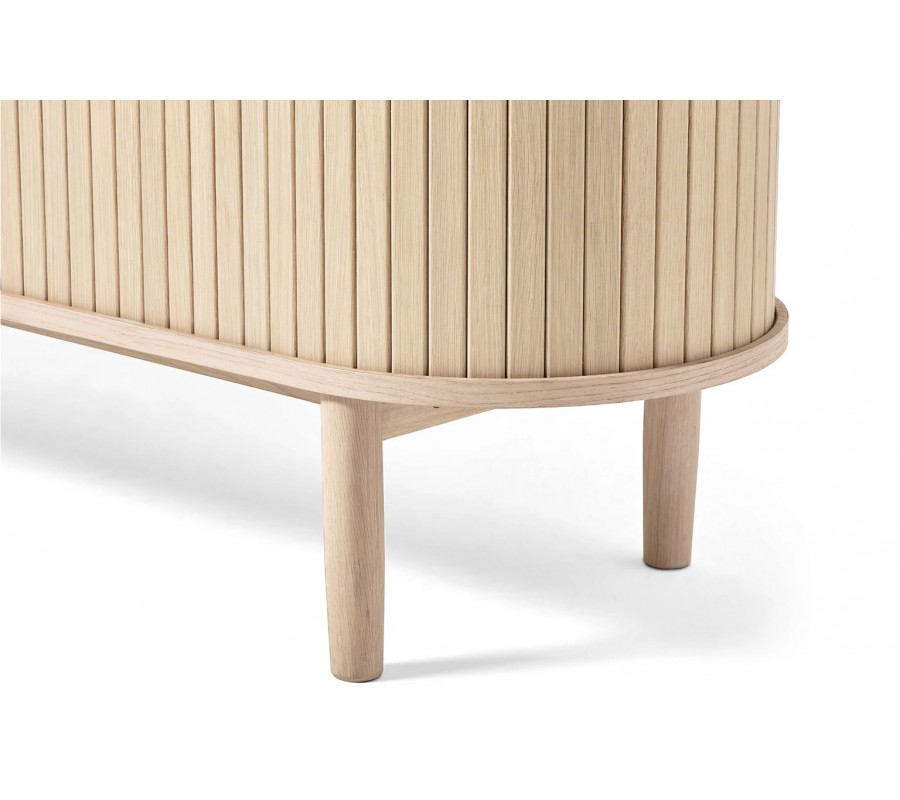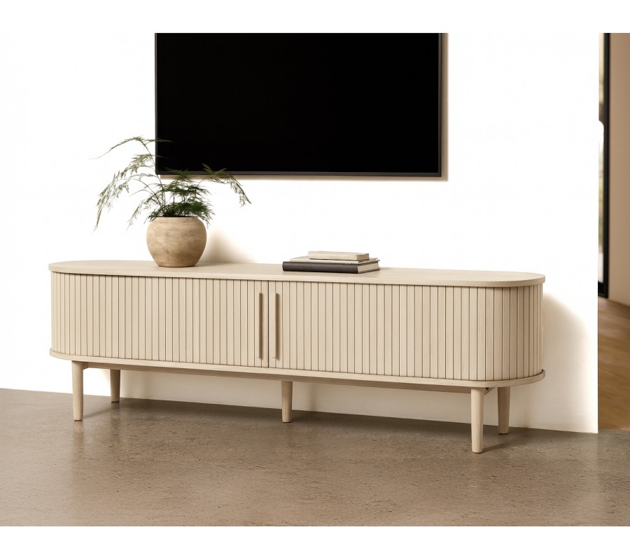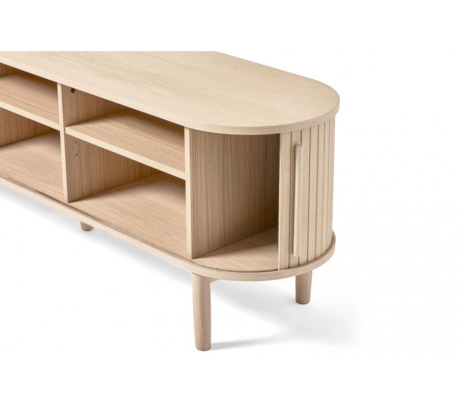 Skandinávský oválný TV stolek Alborg ve světlém hnědém dubovém provedení s posuvnými lamelovými dvířky 180 cm