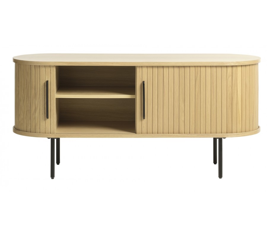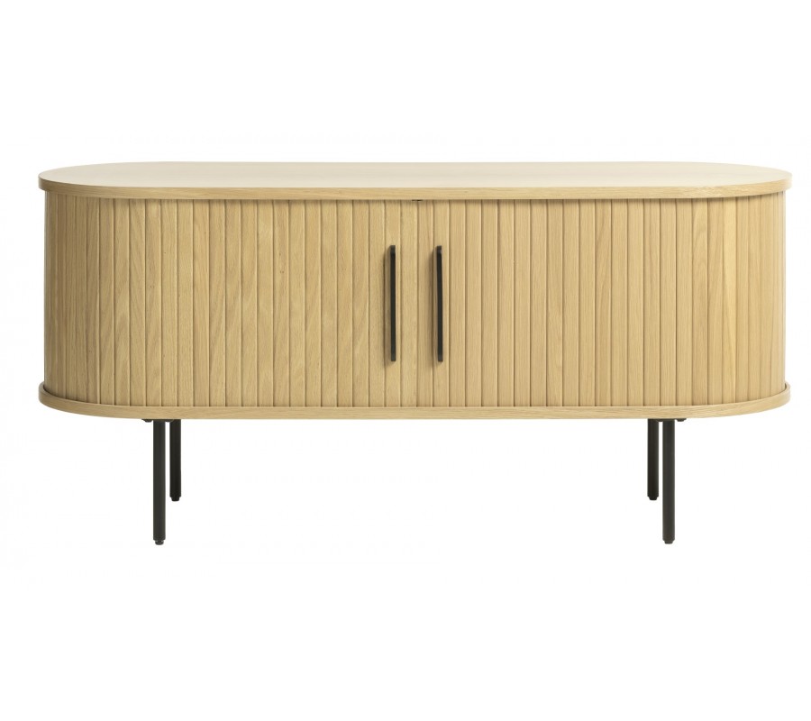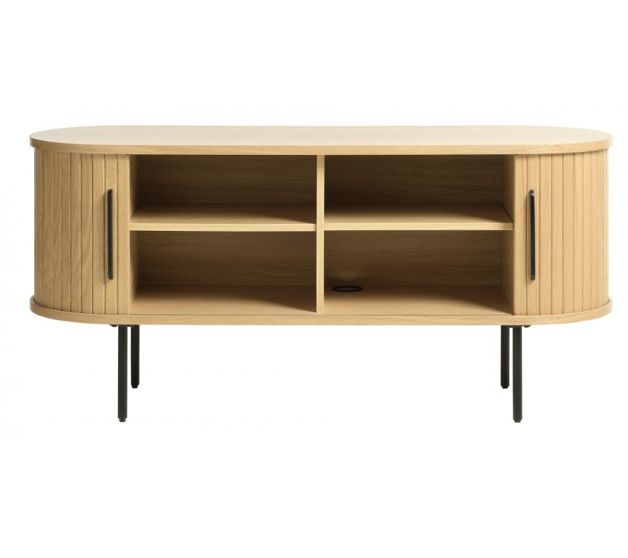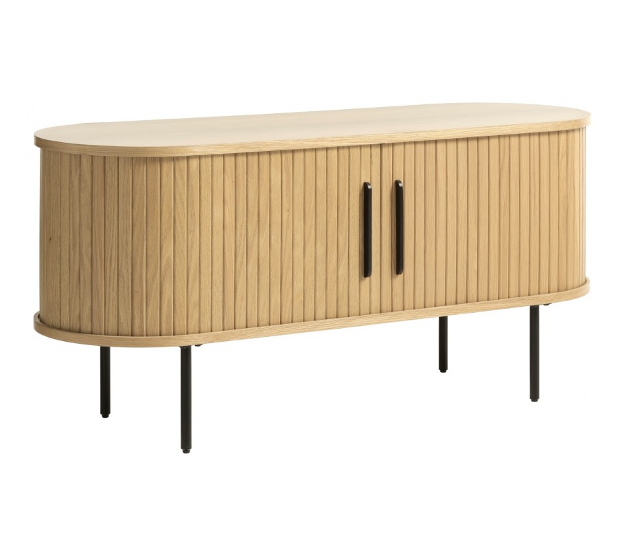 Skandinávský oválný TV stolek Bornholm s posuvnými lamelovými dvířky ve světlém hnědém dubovém provedení 120 cm