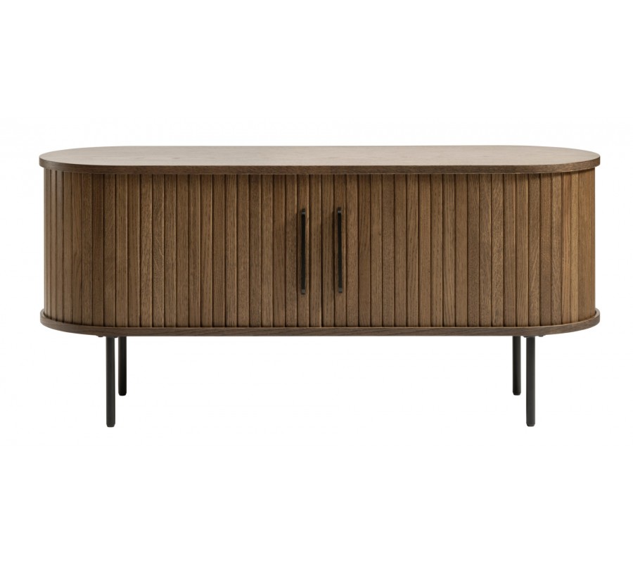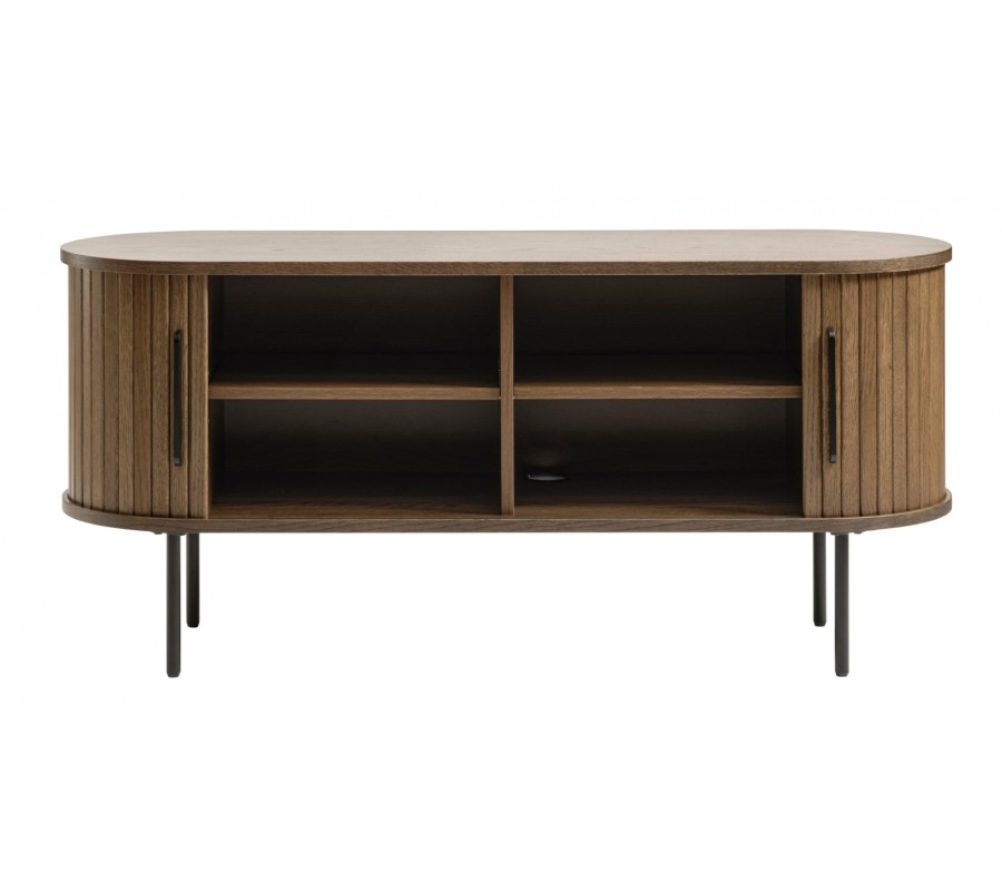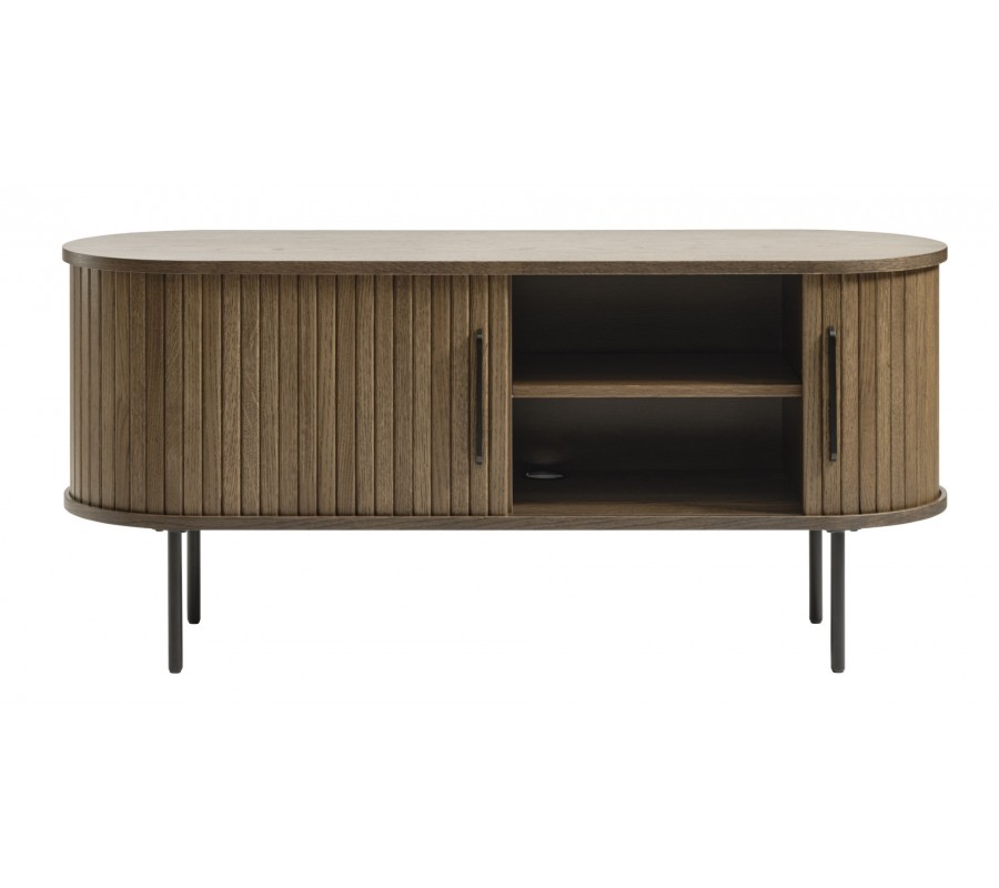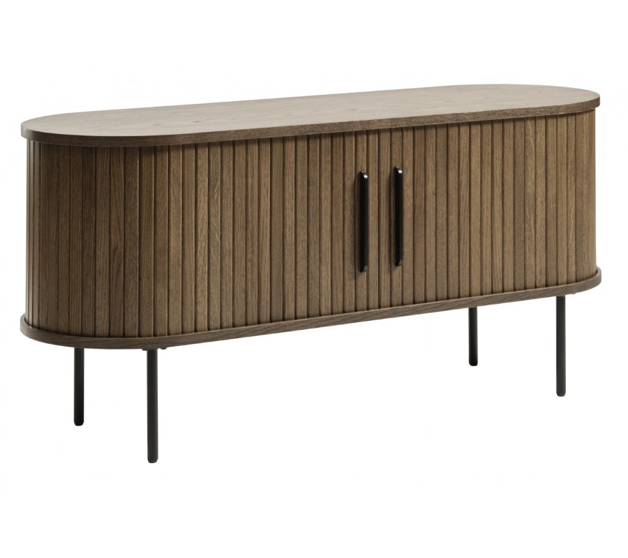Retro oválný dvoudveřový TV stolek Bornholm v tmavém hnědém dubovém provedení s vertikálním lamelovým dekorem 120 cm
