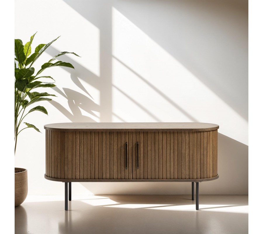 Stolek má ovální siluetu a jeho úložnou část zdobí po obvodu vertikální lamelový reliéf, do kterého jsou nenápadně integrována posuvná dvířka, inspirovaná retro nábytkem. Interiér je předělen na čtyři stejně velká policová místa, organizovaná ve dvou řadách a zaoblené koncové části poskytují dodatečné dvě úložné sekce s plnou výškou. Vrchní deska je hladká a dostatečně prostorná pro umístění televizoru i dekorací.