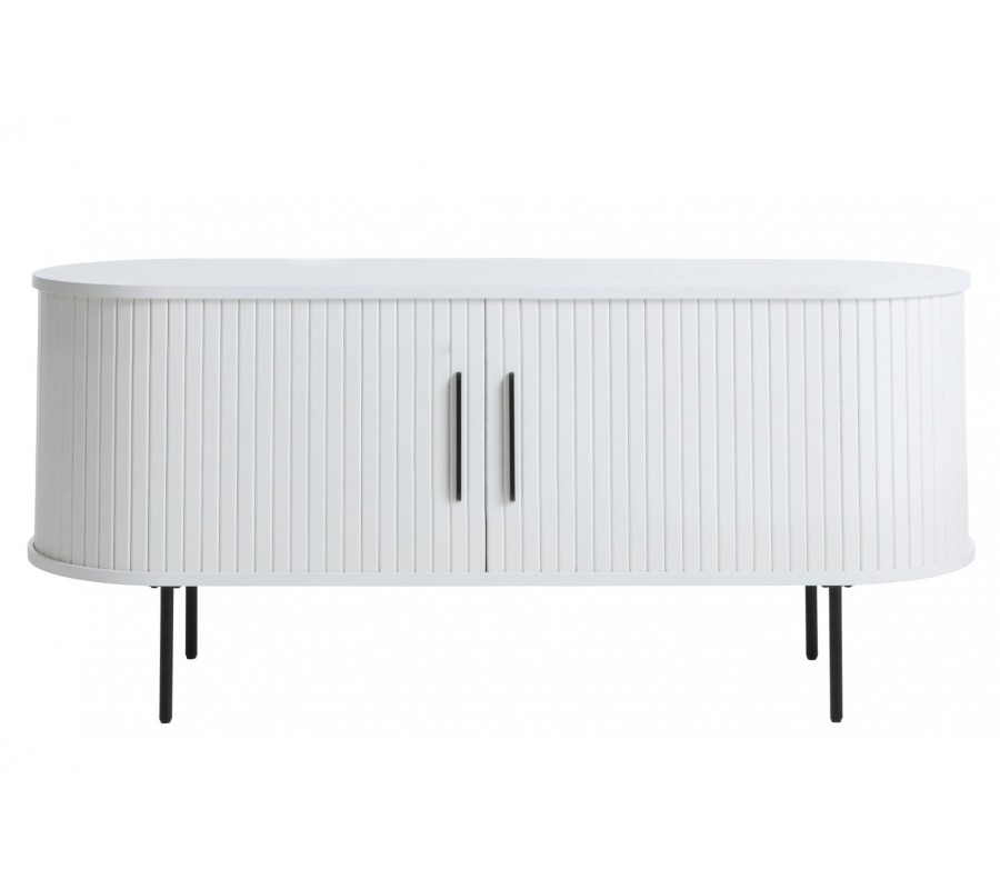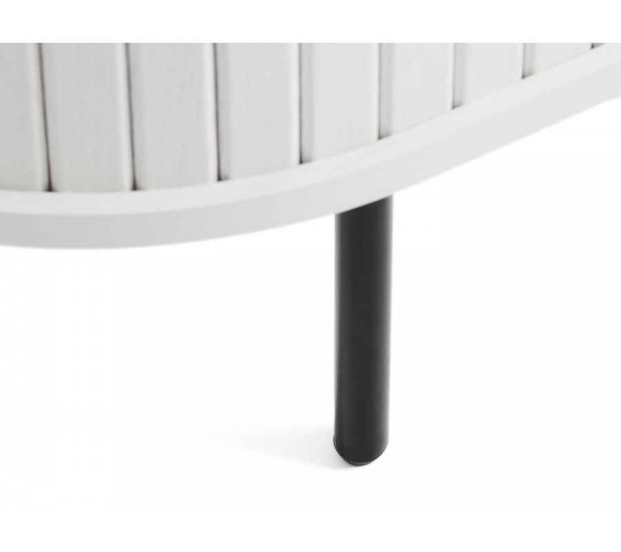 Moderní oválný TV stolek Bornholm v bílé barvě s lamelovými posuvnými dvířky a černými kovovými detaily 120 cm