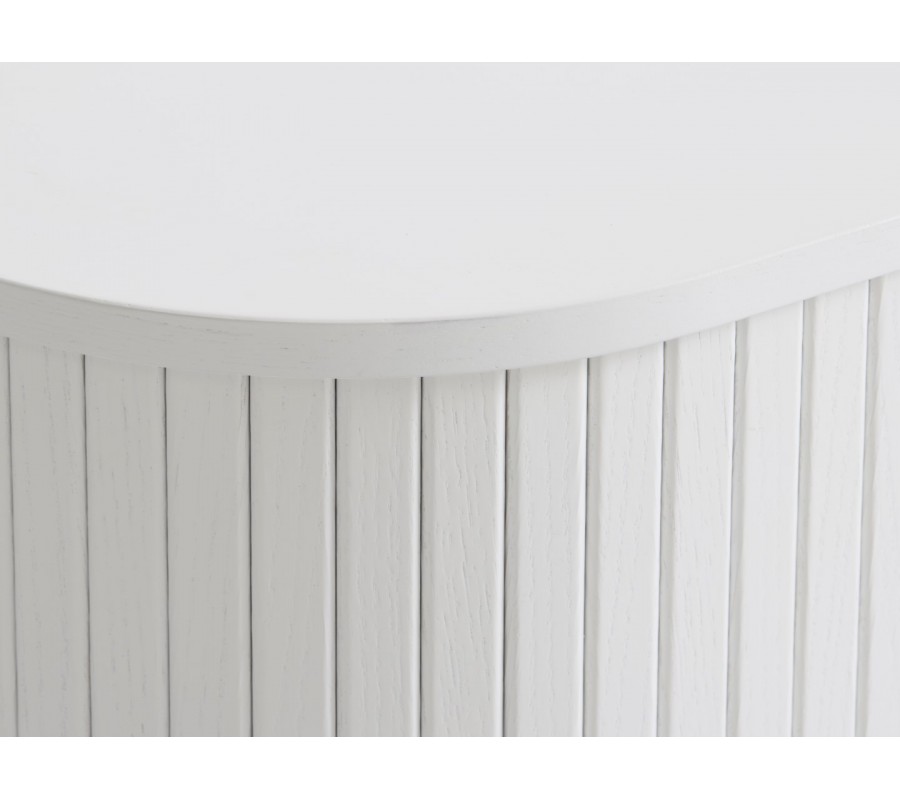 Úložná část má ovální siluetu s hladkou horní deskou a dvěma posuvnými dvířky zdobenými vertikálním lamelovým reliéfem. Tento detail, inspirovaný retro stylem, tvoří výrazný designový prvek a zároveň ladí s minimalistickým vizuálem. Úzké svislé úchyty přirozeně zapadají do lamelového dekoru. Čtyři výše, štíhlé nohy válcovitého tvaru opticky odlehčují robustnější korpus.