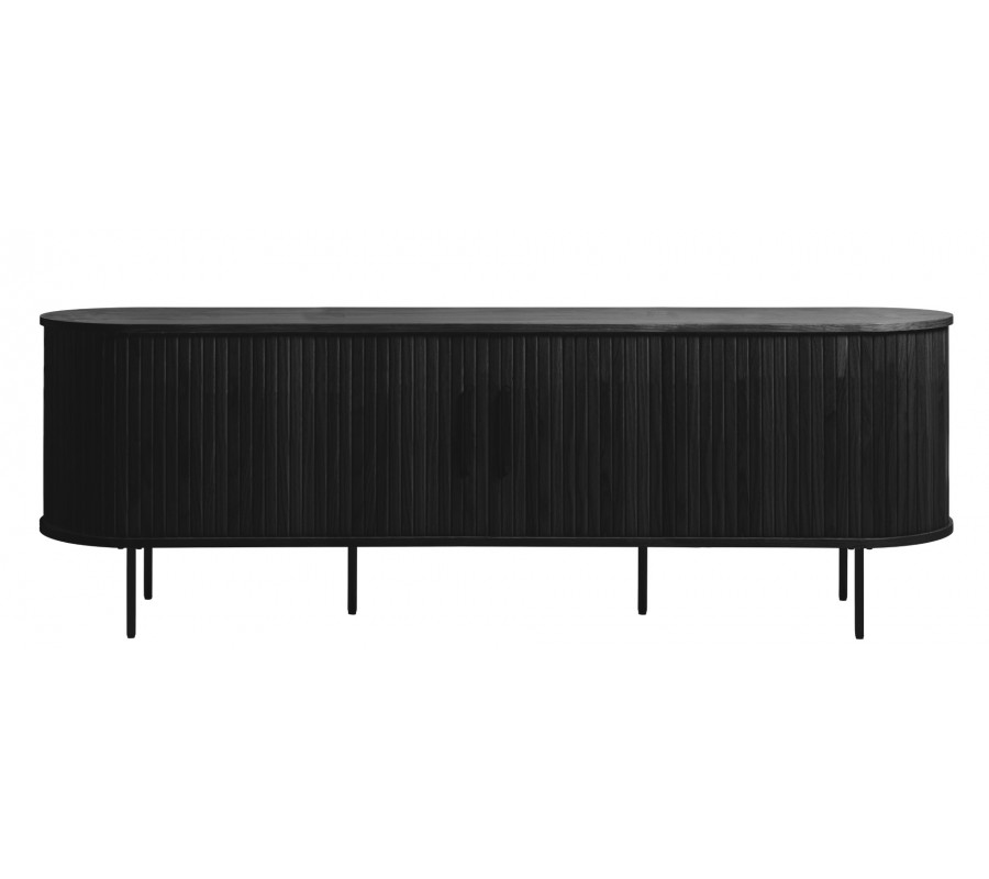 Moderní oválný televizní stolek Bornholm v černém dubovém provedení s posuvnými dvířky s lamelami a kovovými nohami 180 cm