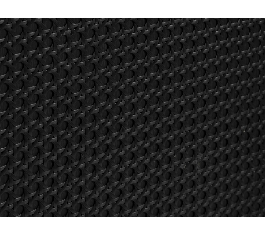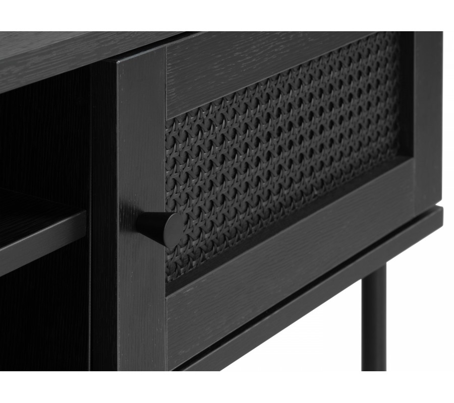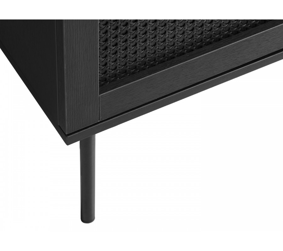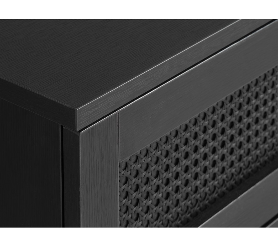 Korpus je vyroben z MDF dýhy s melaminovou povrchovou úpravou, která zajišťuje odolnost vůči každodennímu používání. Celoplošné černé provedení působí moderně a elegantně, přičemž dvířka doplňují kulaté minimalistické úchytky a ratanový výplet s vídeňským vzorem.Tento detail vnáší do designu jemný.